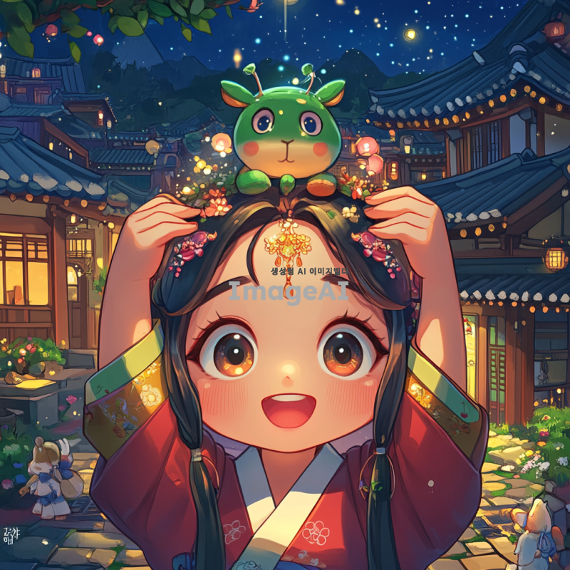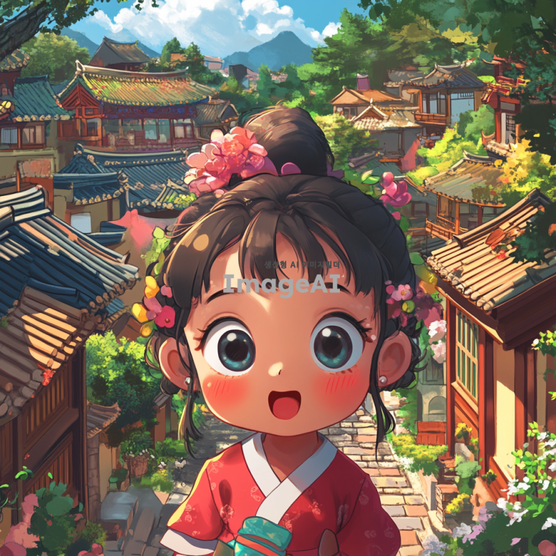한국의 전통적인 분위기에서 딱밤을 맞고 있는 귀여운 캐릭터, 밝은 표정과 함께 놀란 눈을 가진 모습, 주변에 만화적인 효과와 함께 경쾌한 색감, 배경은 한국의 전통 가옥이나 공원 풍경, 캐릭터는 귀여운 스타일로, 동물이나 판타지 요소를 추가하여 재미있고 유머러스한 느낌을 강조.