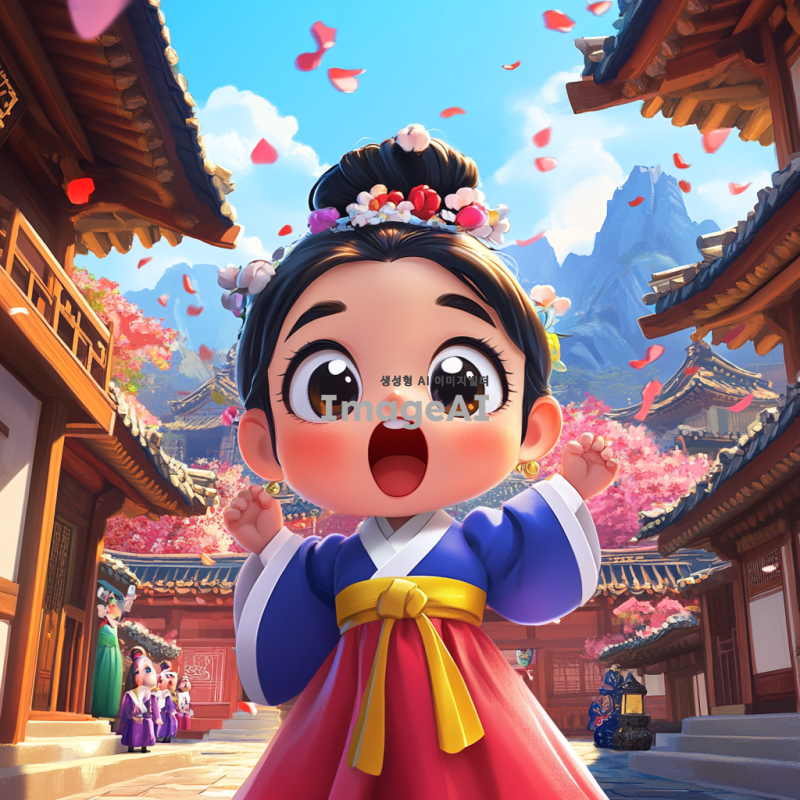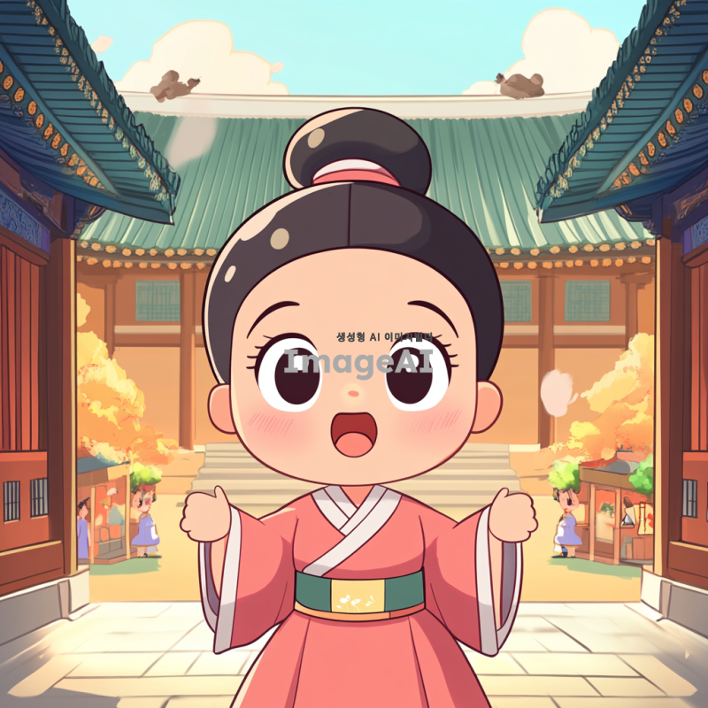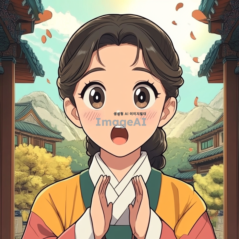 한국의 전통적인 분위기에서 딱밤을 때리고 있는 귀여운 캐릭터, 장난기 가득한 표정과 함께 놀란 눈빛을 표현, 배경은 화사한 색감의 만화 스타일로, 캐릭터는 한국의 전통 의상을 입고 있으며, 유머러스한 상황을 강조하는 요소들로 가득한 장면.