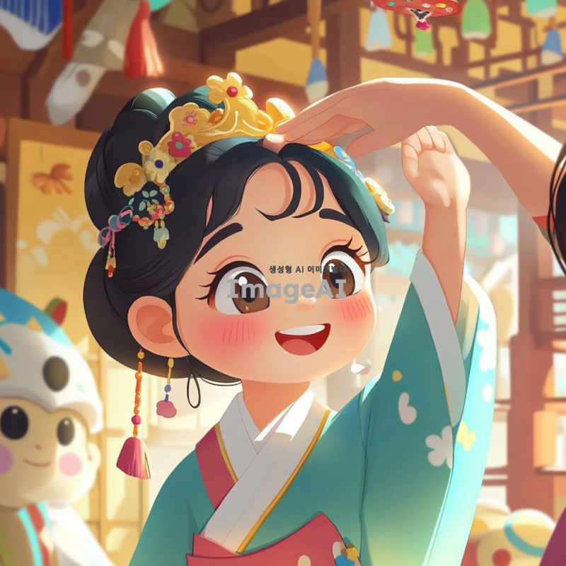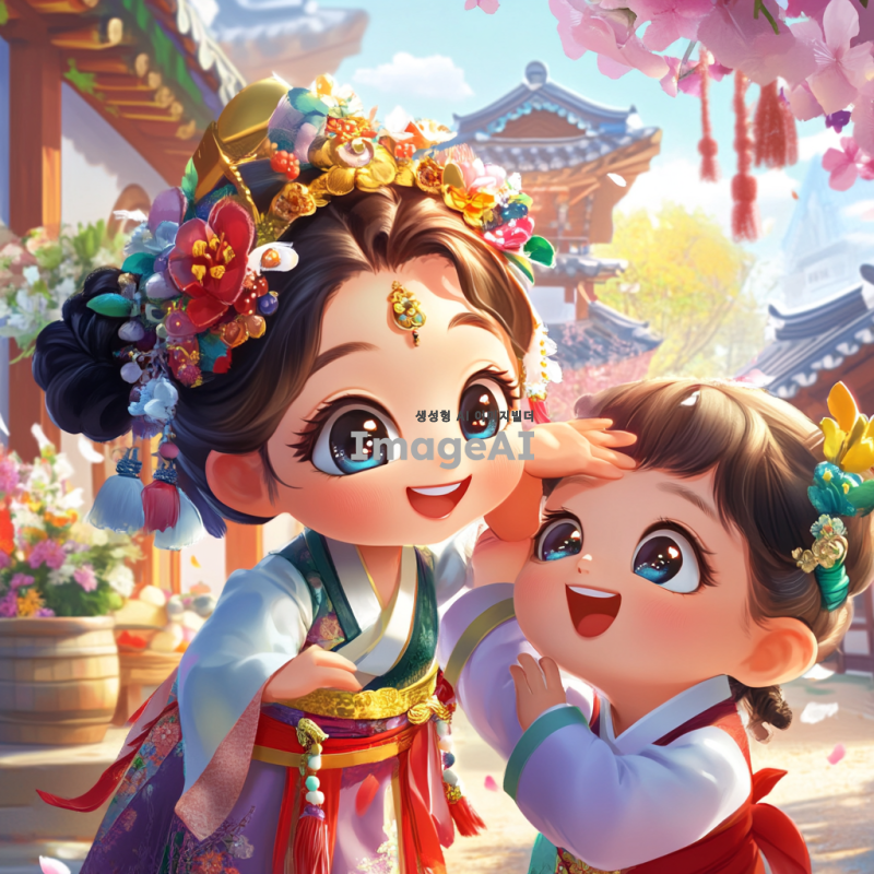 한국의 전통 의상을 입고 있는 귀여운 캐릭터가 장난스럽게 다른 캐릭터의 머리를 딱밤 때리는 모습. 배경은 화사한 색감의 만화 스타일로, 즐거운 분위기를 강조. 캐릭터의 표정은 유쾌하고 장난기 가득하며, 주변에는 다양한 재미있는 소품들이 배치되어 있어 생동감을 더함.