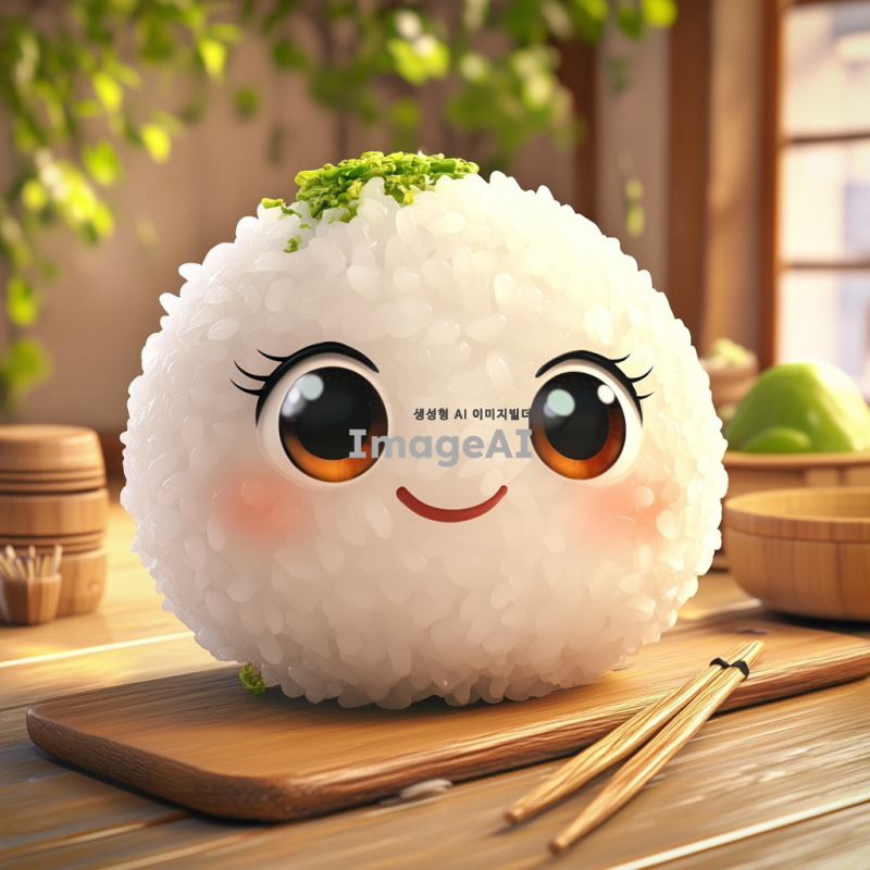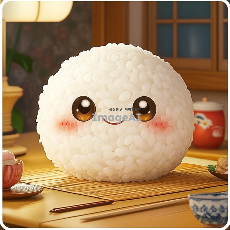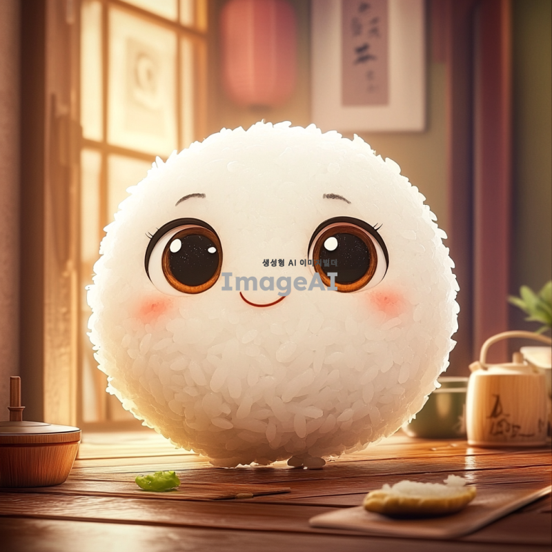 귀여운 밥풀 캐릭터, 큰 눈과 동그란 얼굴, 아기자기한 소품들이 있는 장면, 따뜻하고 아늑한 느낌, 만화 스타일
