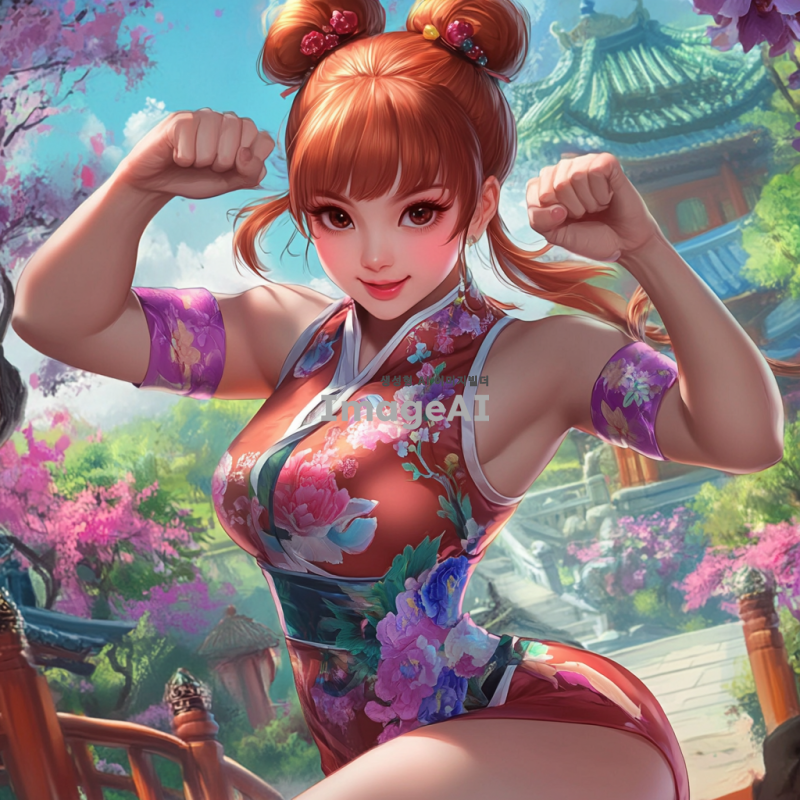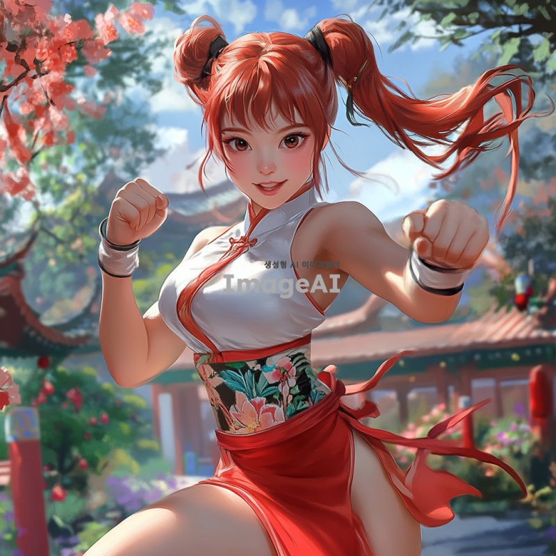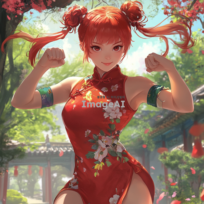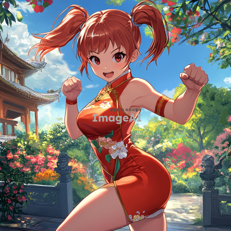 빨간 꽁지 머리를 가진 활기찬 한국 여자 아이가 몸에 딱 맞는 미니 치파오를 입고 있는 모습. 그녀의 눈은 새초롬하며, 무술을 하는 자세로 역동적인 포즈를 취하고 있다. 배경은 전통적인 중국 정원으로, 화려한 꽃과 나무들이 어우러져 있다.