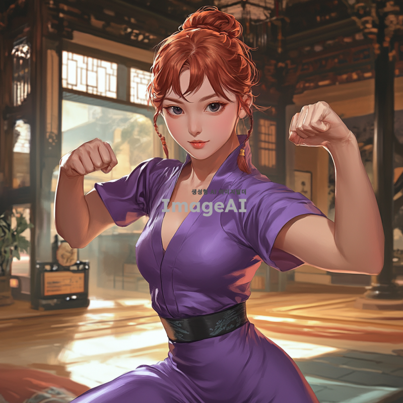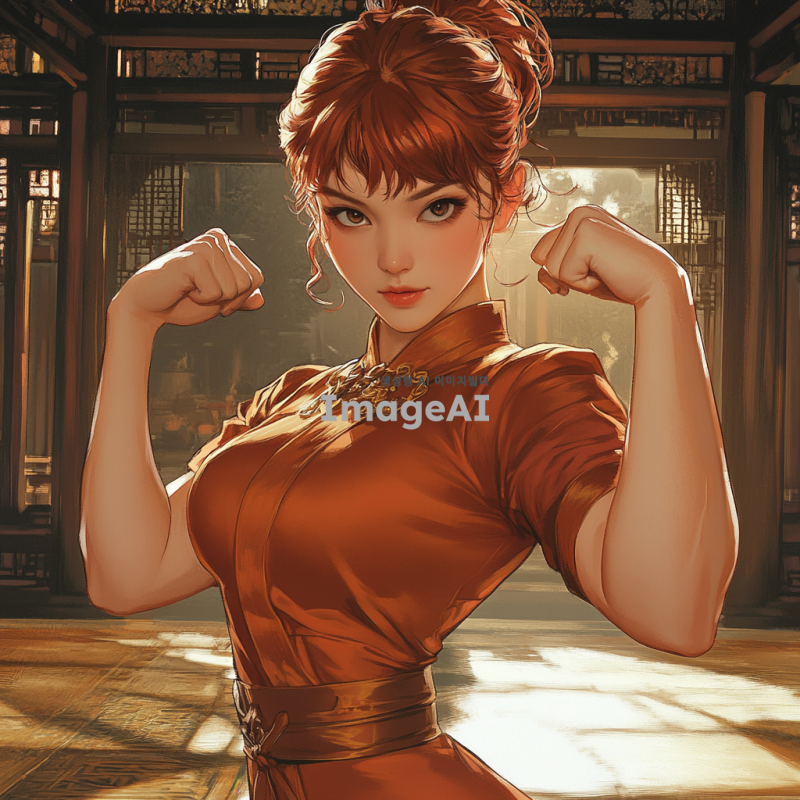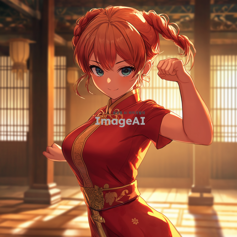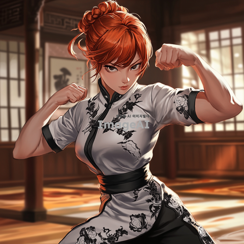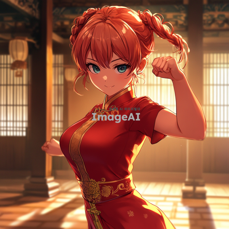 짧은 빨간색 머리를 하나로 땋은 한국 소녀가 딱 붙는 치파오를 입고, 눈고리가 위로 올라간 모습. 무술을 수행하는 역동적인 자세로, 강한 자신감이 느껴지는 표정. 배경은 전통적인 중국 무술 도장으로 설정.