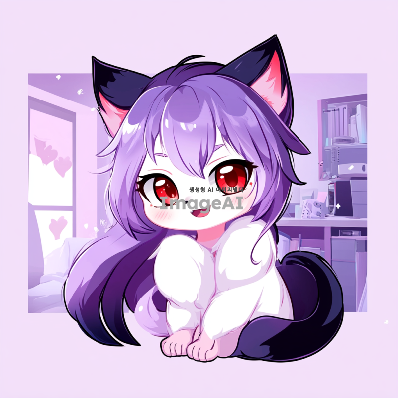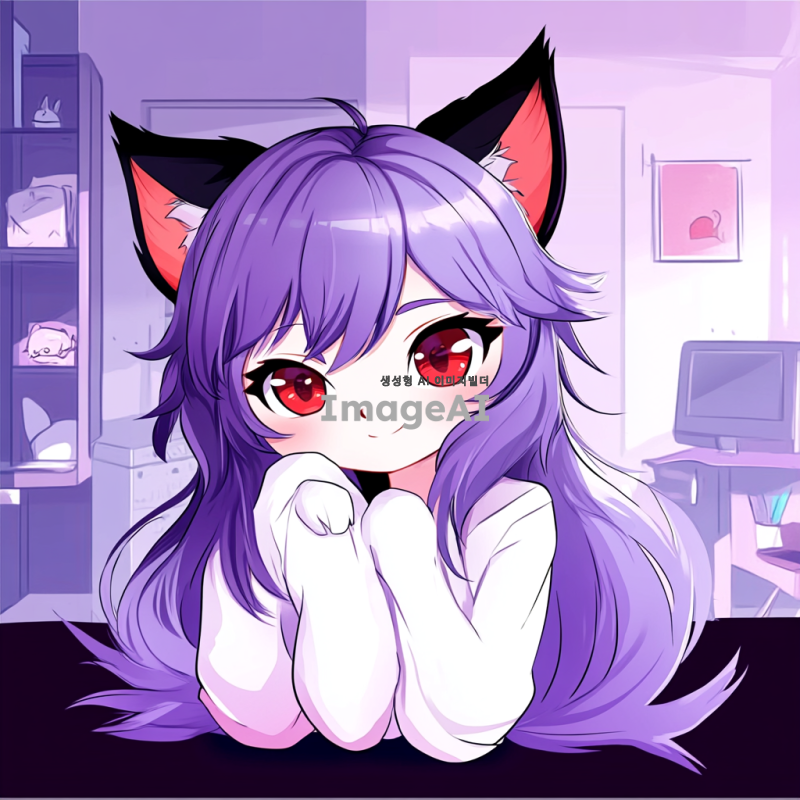 귀여운 여우 캐릭터, 연보라색 머리카락을 가진, 밝고 장난꾸러운 표정, 적안, 만화 스타일