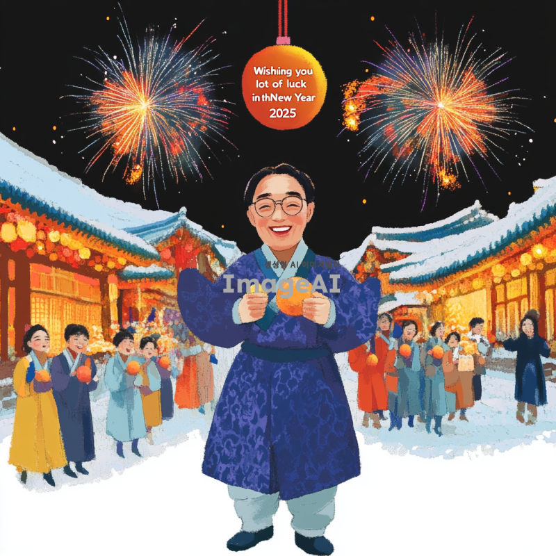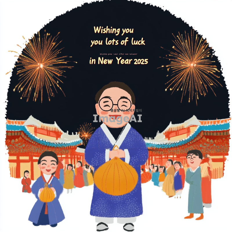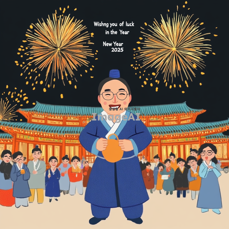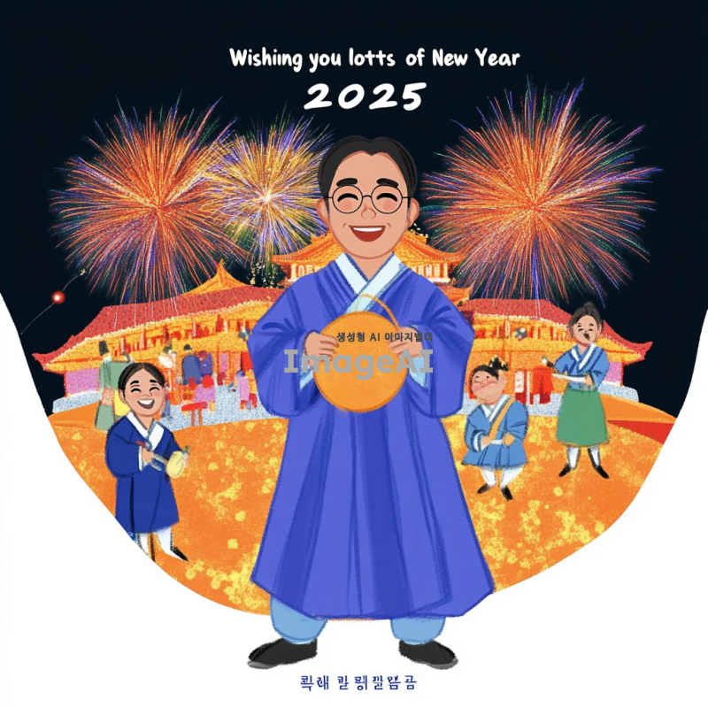 2025년 새해를 맞이하여 기쁜 인사를 전하는 장면, 한국 전통 문양과 현대적인 디자인이 어우러진 배경, 화려한 불꽃놀이가 하늘을 수놓고, 사람들은 새해를 축하하며 웃고 있는 모습, 따뜻한 느낌의 색감으로 가득한 이미지, "2025년 새해 복 많이 받으세요"라는 문구가 아름답게 배치된 모습