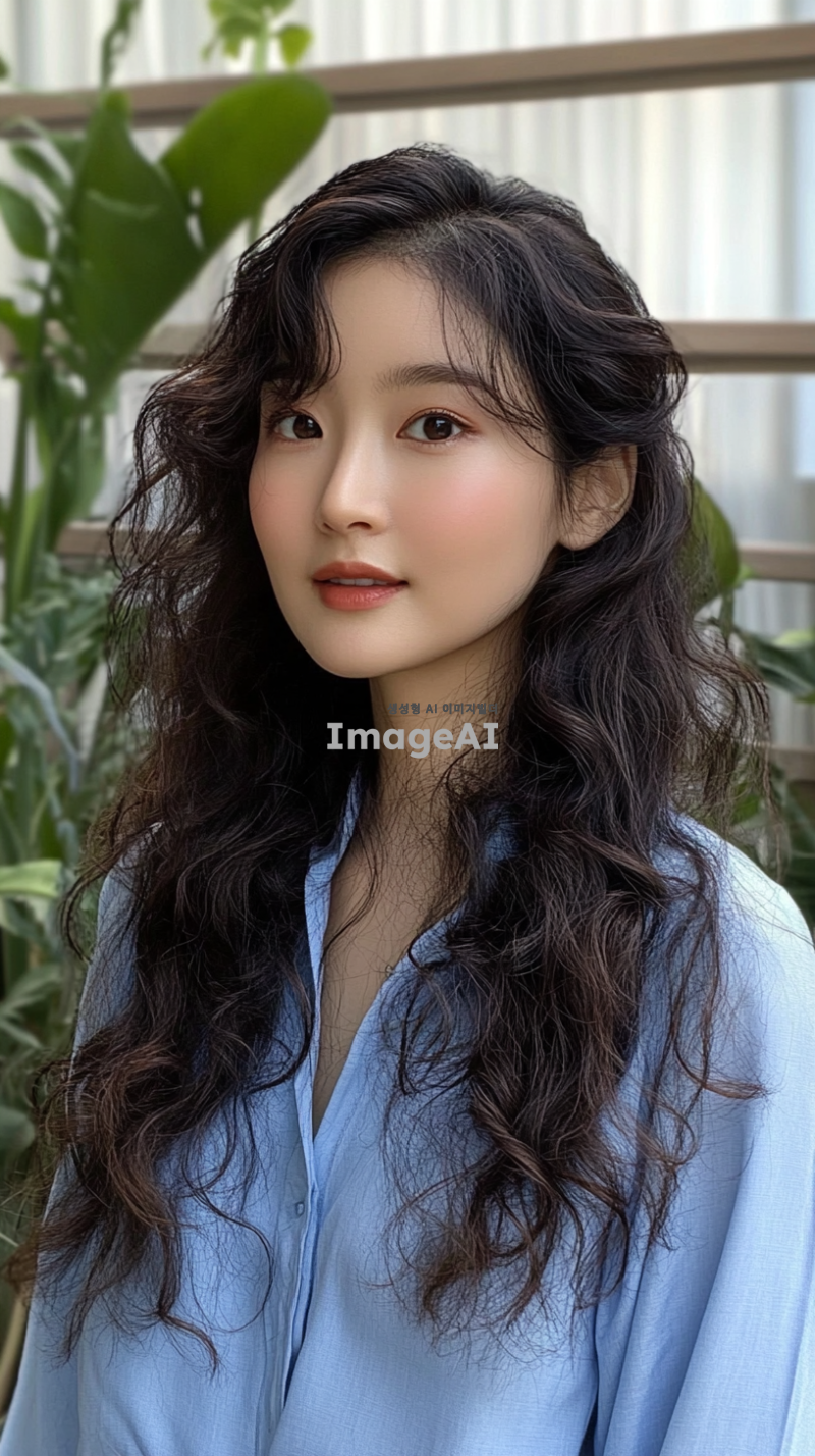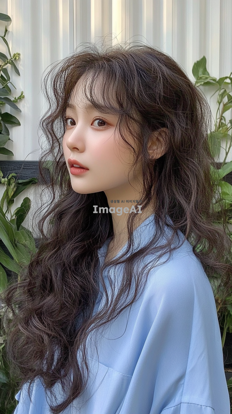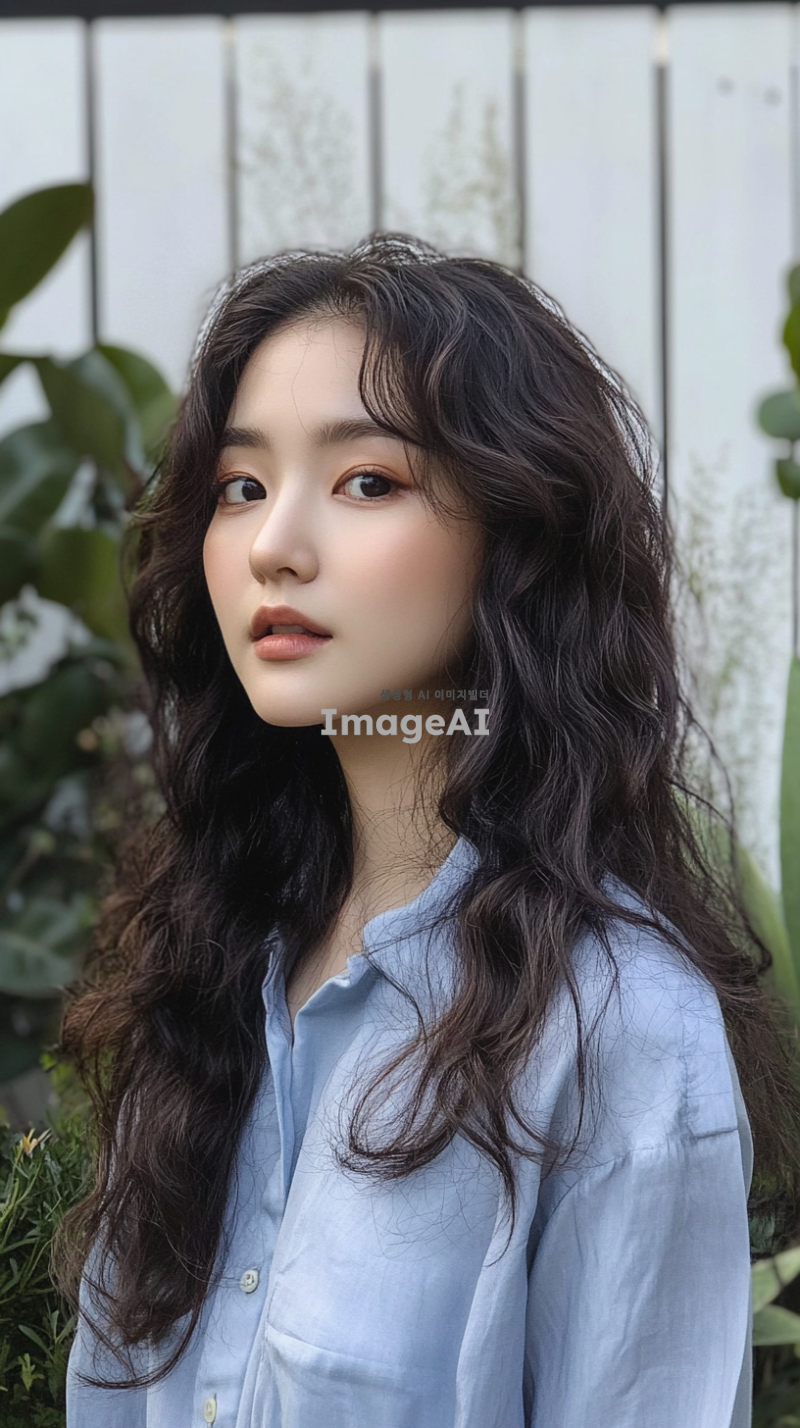 아시아 여성의 사진으로, 긴 곱슬머리를 느슨한 물결 모양으로 스타일링하고 연한 파란색 셔츠를 입고 있습니다. 그녀는 정원 울타리 앞에 서서 오른쪽에서 왼쪽을 바라보고 있습니다. 배경에는 초록 식물과 하얀 벽이 있습니다. 그녀의 표정은 차분하고 자신감 있어 보입니다.