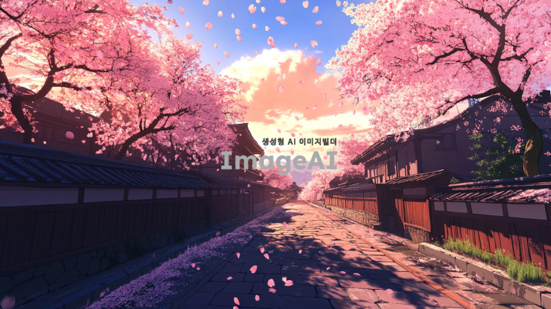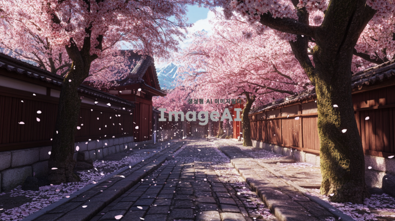 이미지 생성 부탁 일본 전통 교토의 만발한 벚나무, 벚꽃잎, 벚꽃잎은 ffd9e5, ffe4e1 정도의 색상, 명도로 해주고 벚꽃은 꽃잎이 5개란다. 그리고 흩날리는 벚꽃잎은 반드시 한 잎이어야 하고 끝부분이 진짜 벚꽃처럼 갈라져있어야 해