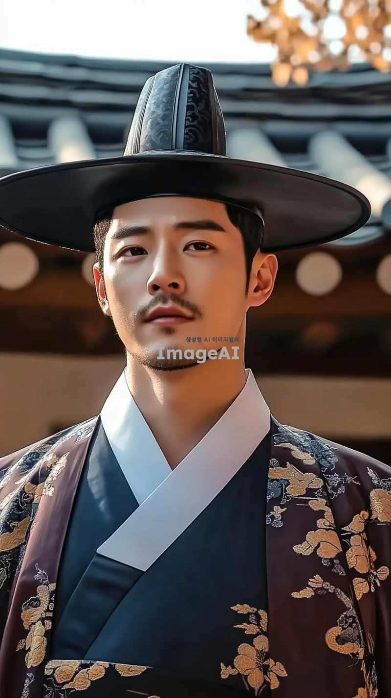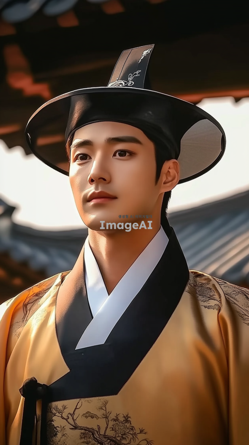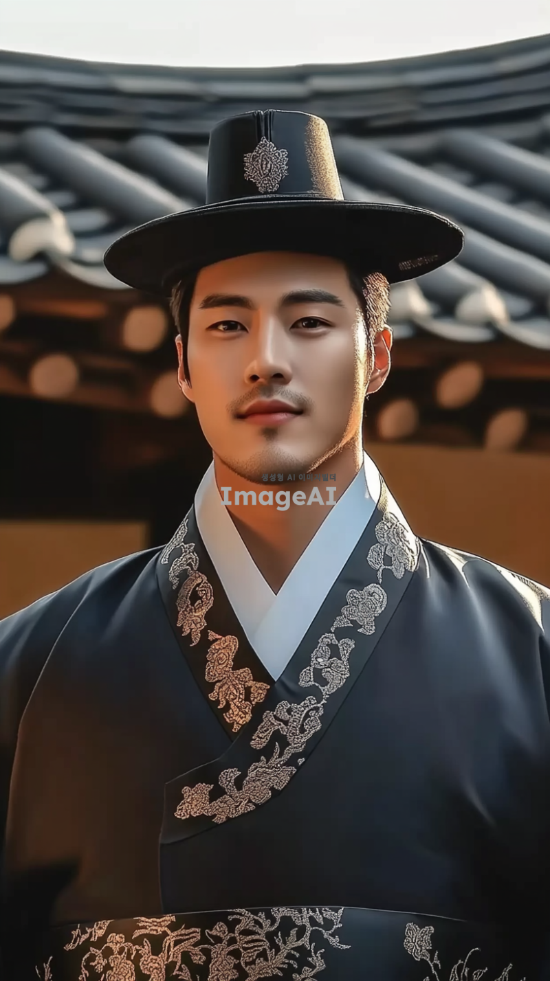 20대의 근육질 남자가 전통 한복을 입고 있는 모습, 배경은 한국의 고풍스러운 전통 건축물이나 아름다운 자연 풍경, 남자의 표정은 자신감 넘치고 우아한 느낌, 한복의 색상은 화려하고 세련된 디자인, 조명은 따뜻하고 부드러운 느낌으로 설정.