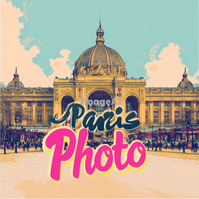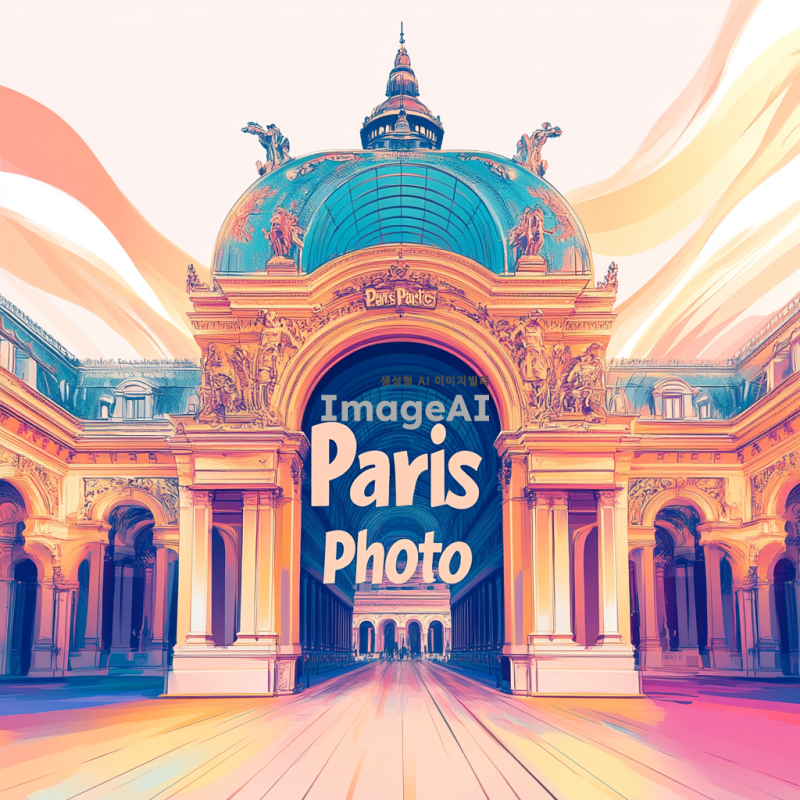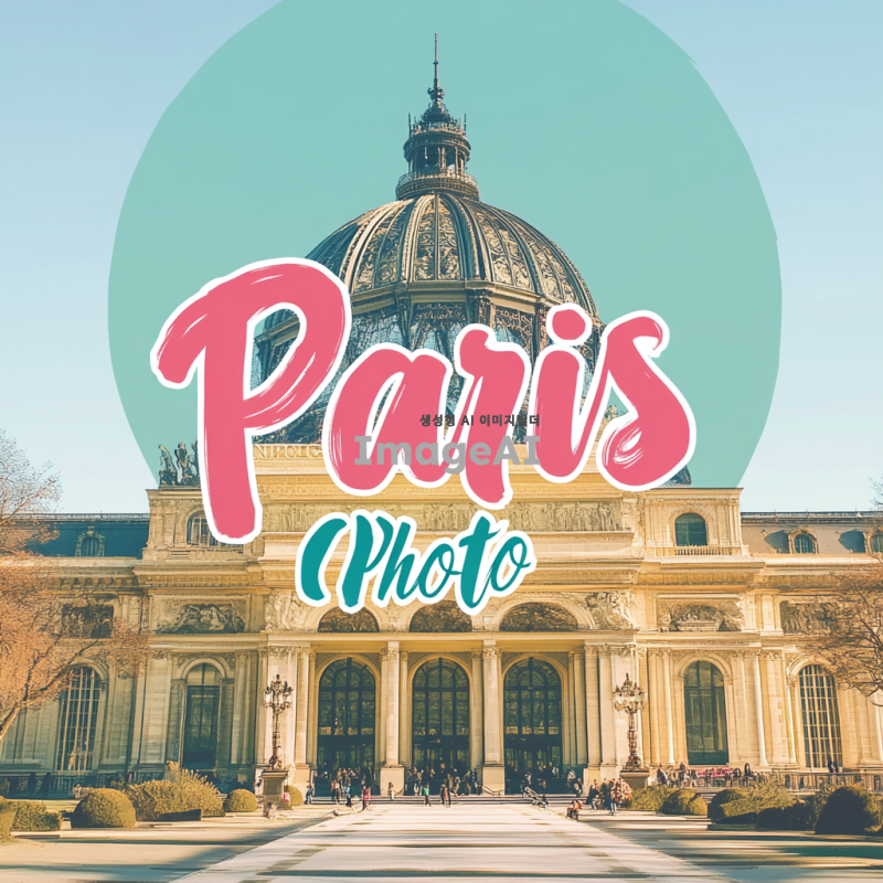 파리의 아름다운 풍경과 유명한 랜드마크들이 어우러진 포스터 디자인, 화사한 색감과 예술적인 요소를 강조하여 현대적인 감각을 살린 스타일, "파리포토"라는 텍스트를 중앙에 배치하고 세련된 폰트를 사용하여 시선을 끌도록 구성, 배경에는 파리 그랑팔레를 포함, 전체적으로 매력적인 분위기를 연출. 인스타그램 포스팅 사이즈로