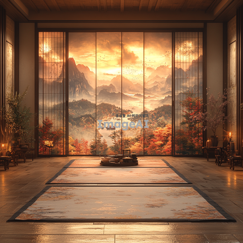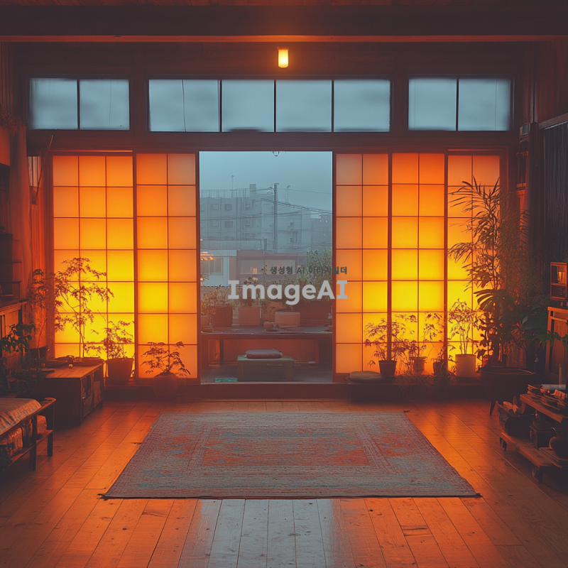 한국의 전통 문풍지 뒤에서 흐릿하게 비디오가 재생되고 있는 장면, 비디오는 색감과 형태로만 표현되며, 문풍지의 섬세한 질감과 패턴이 강조된 이미지. 조명은 부드럽고 따뜻한 느낌을 주며, 전체적인 분위기는 아늑하고 몽환적이다.