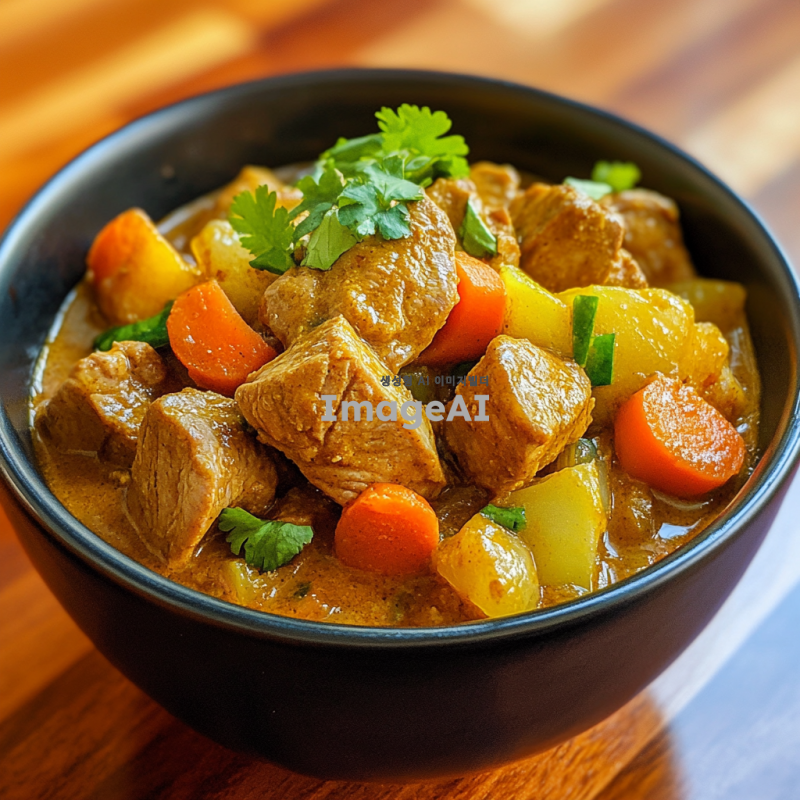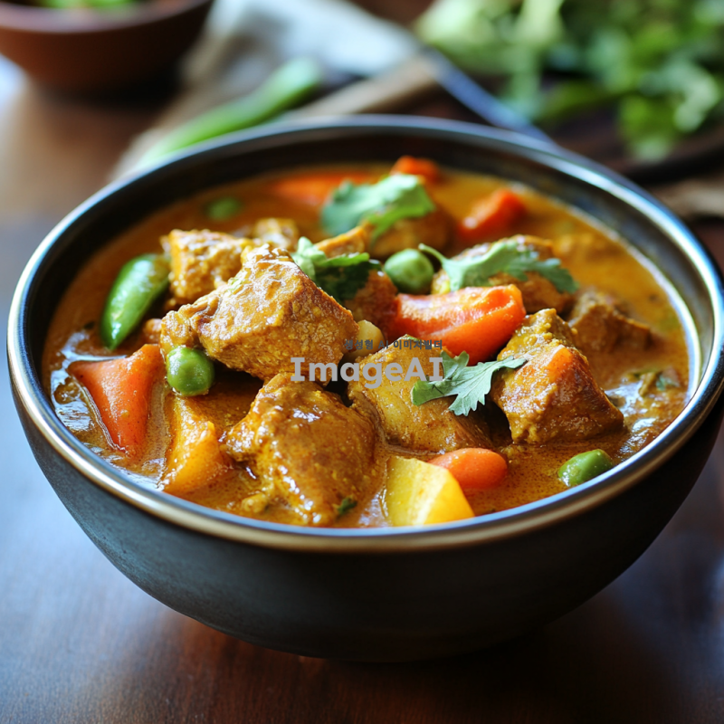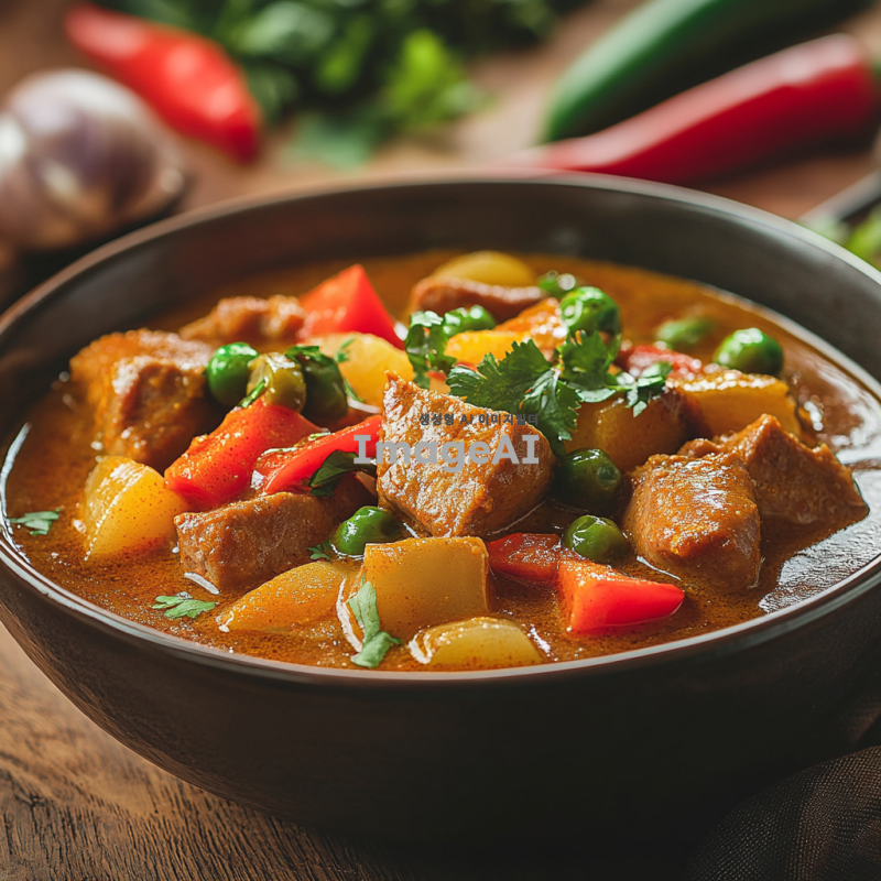 돼지등심 고기가 들어간 카레의 이미지를 생성하기 위해, 풍성한 재료와 함께 맛있게 조리된 카레를 담은 그릇을 중심으로 하여, 고소한 향이 나는 카레의 색감과 질감을 강조한다. 배경은 아늑한 주방이나 식탁으로 설정하고, 카레 위에 신선한 채소와 고기 조각들이 잘 보이도록 배열한다.