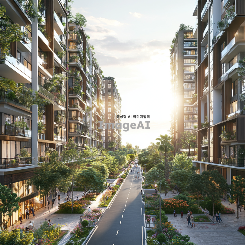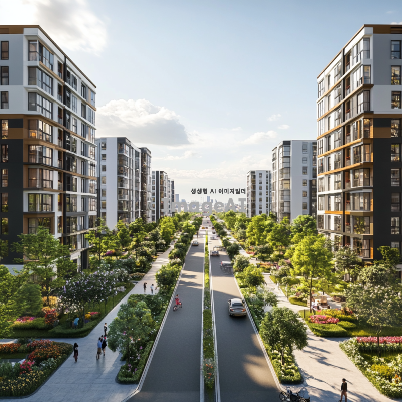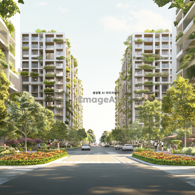 독립문처럼 가운데 차가 다닐 수 있는 길이 뚫려 있는 아파트 동의 외관을 그려줘. 아파트는 현대적인 디자인으로, 양쪽에는 녹색의 나무와 화단이 조화롭게 배치되어 있으며, 하늘은 맑고 햇살이 비치고 있다. 아파트 동의 중앙에는 넓은 도로가 있어 차량이 통행할 수 있고, 주변에는 사람들이 산책하거나 대화하는 모습이 보인다. 전체적인 분위기는 평화롭고 아늑하며, 도시의 활기를 느낄 수 있는 장면을 담아줘.