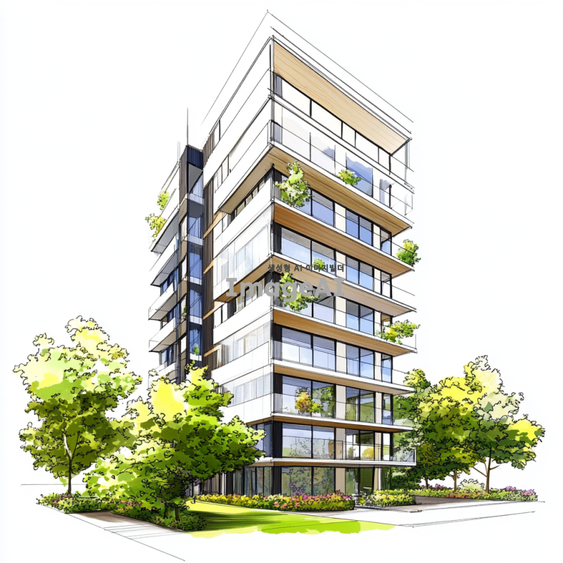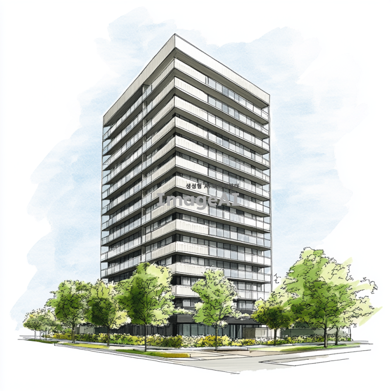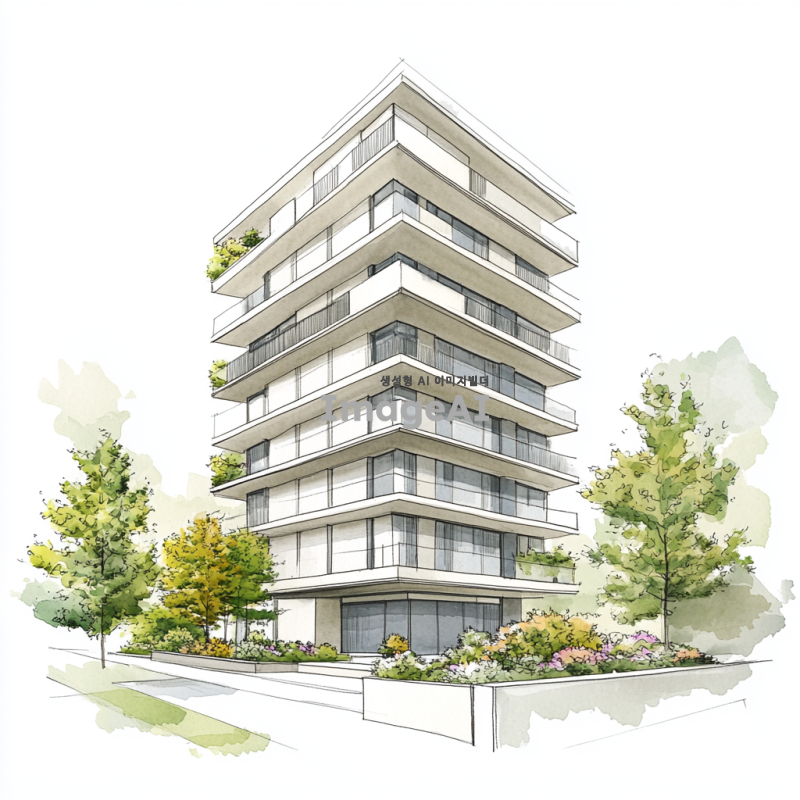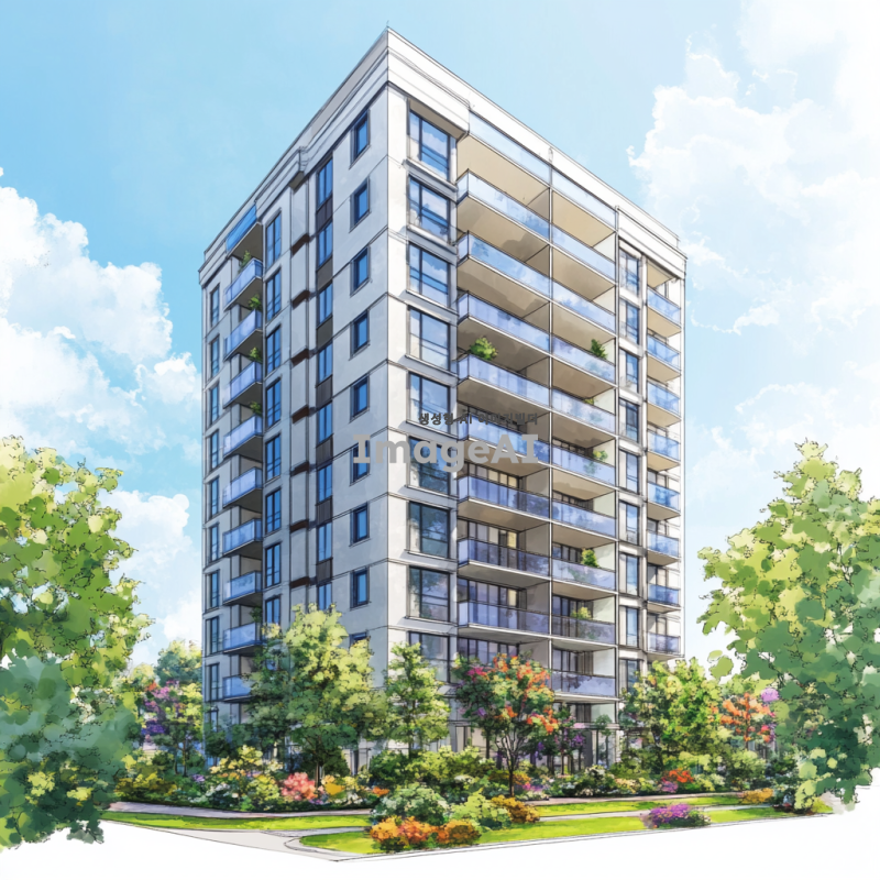 14층짜리 현대적인 아파트 건물의 외관을 그려주세요. 건물은 세련된 디자인으로, 큰 창문과 발코니가 있는 모습이며, 주변에는 푸른 나무와 꽃들이 조화롭게 배치되어 있습니다. 하늘은 맑고 햇살이 비추는 날씨로 설정해 주세요. 아파트 건물의 색상은 밝은 톤으로, 모던한 느낌을 강조해 주세요.