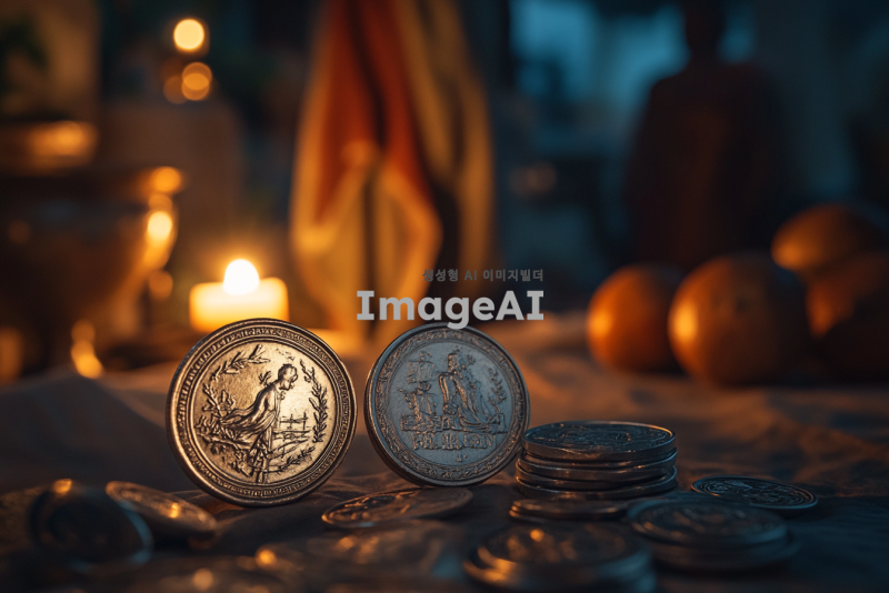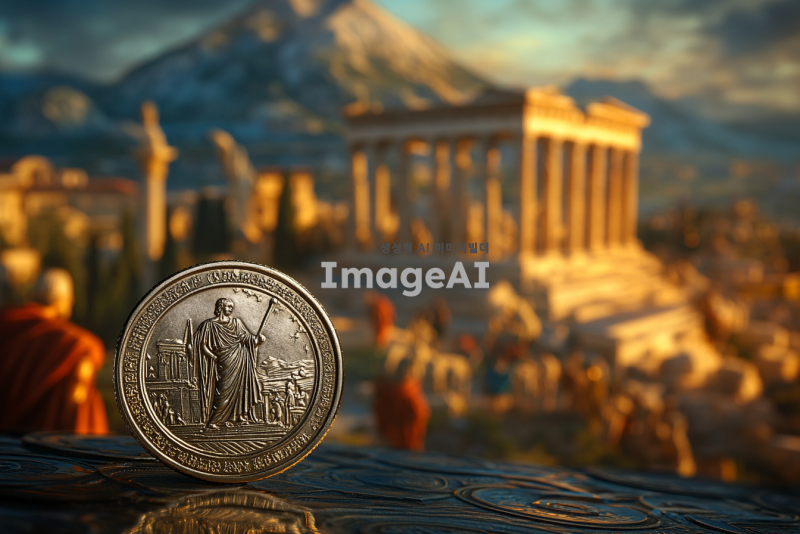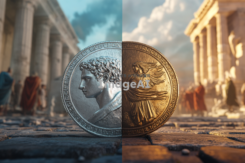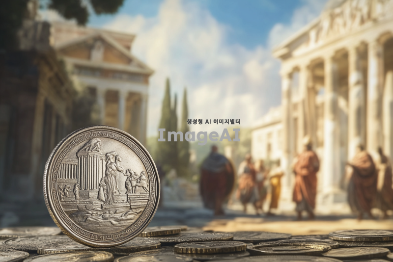 은화 1달란트와 6000드라크마의 동전을 나란히 놓고 비교하는 장면, 고대 그리스와 로마의 배경, 은화의 반짝임과 드라크마의 독특한 디자인을 강조, 역사적인 느낌을 주는 조명과 색감, 고대 상인들이 거래하는 모습이 배경에 흐릿하게 보이도록 구성.