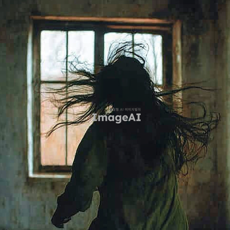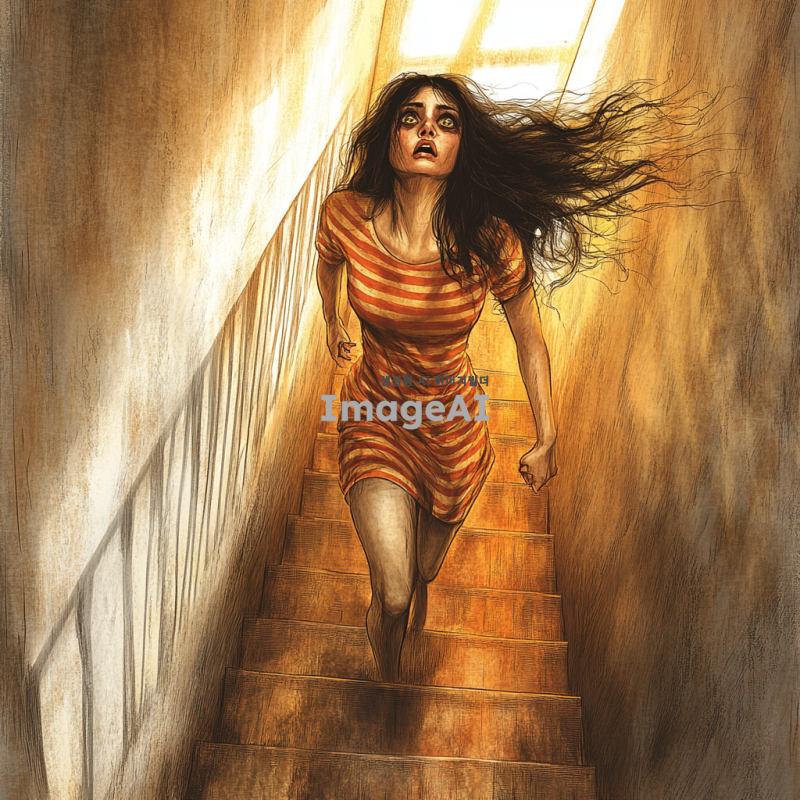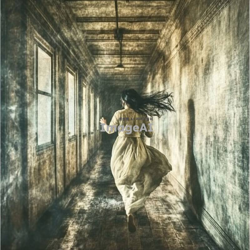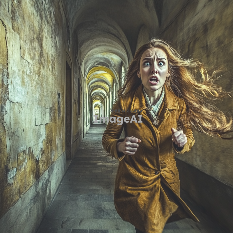 어두운 복도를 뛰어가며 공포에 질린 아름다운 여성의 모습, 긴 머리가 바람에 휘날리며, 두려움에 찬 눈빛, 어두운 그림자와 불빛이 교차하는 분위기, 긴장감 넘치는 상황, 사실적인 스타일