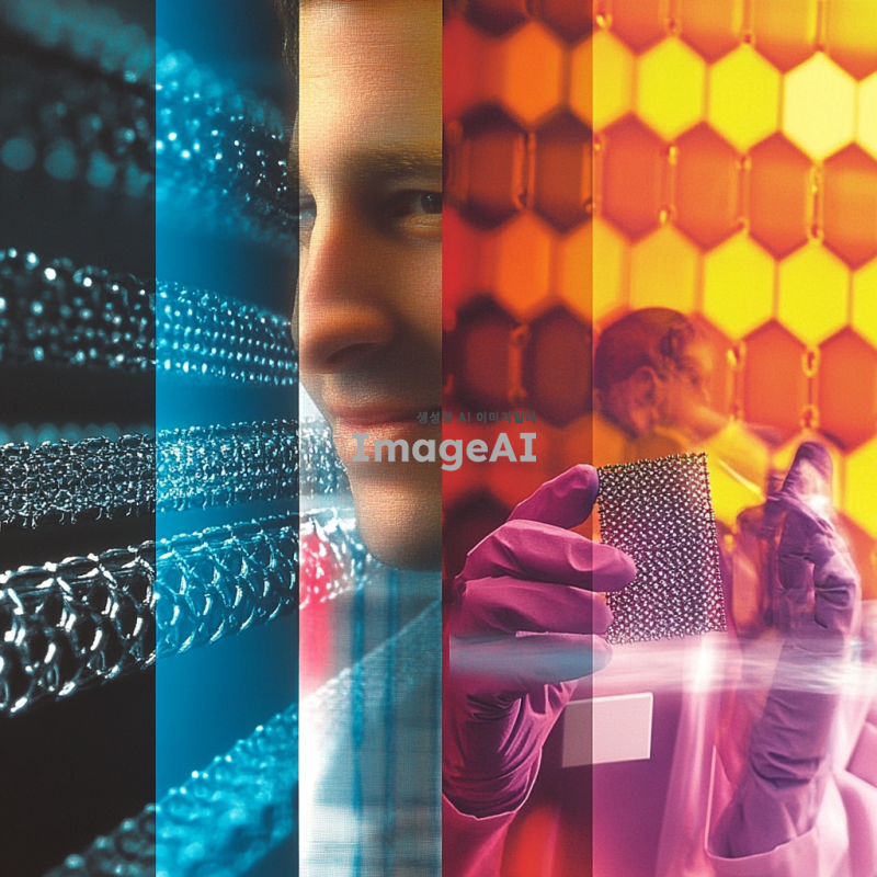 탄소 나노 튜브와 그래핀의 구조를 묘사한 이미지, 나노 스케일에서의 탄소 나노 튜브와 그래핀의 상호작용을 보여주는 장면, 과학 실험실 배경에서 연구자가 탄소 나노 튜브와 그래핀을 다루고 있는 모습, 현대적인 디자인의 그래핀 기반 전자기기를 손에 들고 있는 한국인 연구자의 모습, 탄소 나노 튜브를 이용한 혁신적인 기술을 설명하는 인포그래픽 스타일의 이미지.