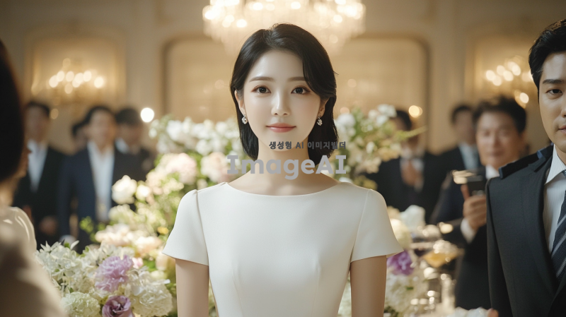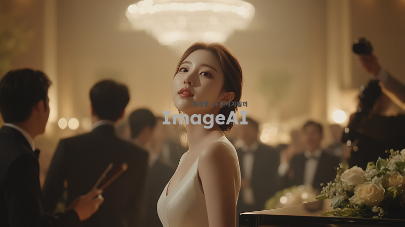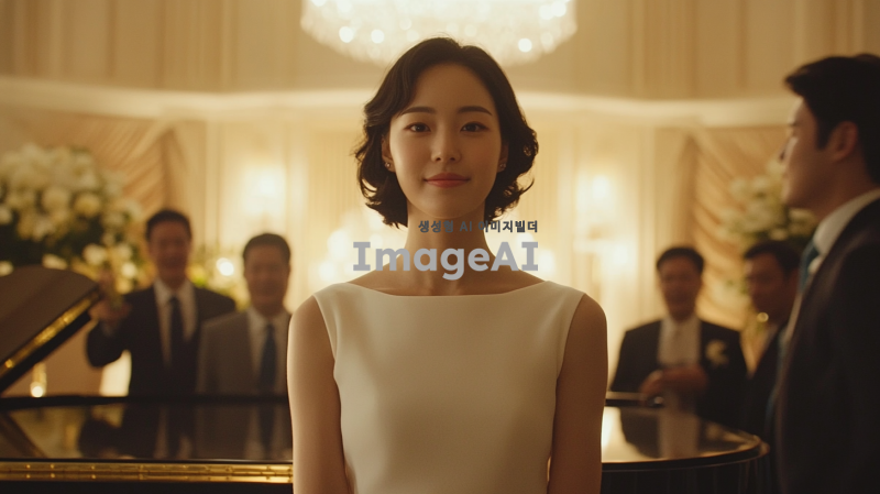20대 한국인 여성 피아니스트가 피아노 대회에서 우승한 후 격식 있는 파티에서 우아하게 서 있는 장면을 묘사합니다. 그녀는 반팔 흰색 원피스를 입고 있으며, 아름다운 얼굴에 희미한 미소를 띠고 있습니다. 주변에는 정장을 입은 외국인들이 모여 있으며, 그들은 그녀의 성취를 축하하는 듯한 표정을 짓고 있습니다.