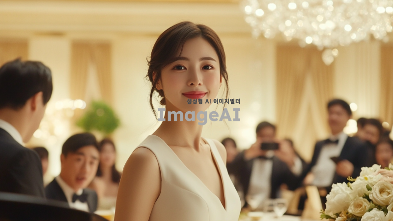 배경은 고급스러운 호텔 연회장으로, 화려한 샹들리에가 천장에서 빛나고 있고, 벽면은 부드러운 크림색으로 되어 있습니다. 테이블 위에는 화려한 꽃 장식과 함께 고급스러운 음료가 놓여 있습니다. 조명은 부드럽고 따뜻한 느낌을 주며, 전체적인 분위기는 축하와 기쁨으로 가득 차 있습니다.