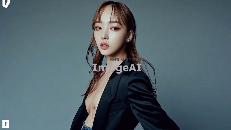 젊고 예쁜 K-pop 아이돌이 우아한 검은색 블레이저와 하이웨이스트 청바지를 입고 있습니다. 그녀는 느슨한 웨이브로 머리를 묶고 약간의 앞머리가 내려와 있습니다. 배경은 간단한 회색 그라데이션으로, 어두운 수트 재킷과 부드러운 피부 톤의 대비를 강조합니다. 그녀는 한 손을 엉덩이에 얹고 카메라를 직접 바라보며 자연스러운 포즈를 취하고 있습니다.