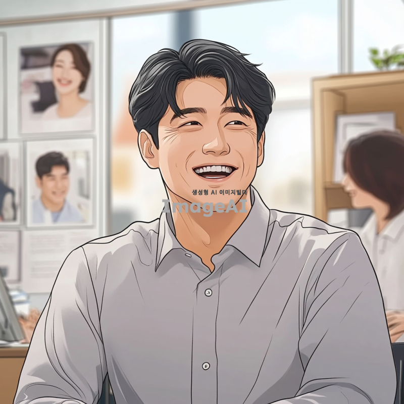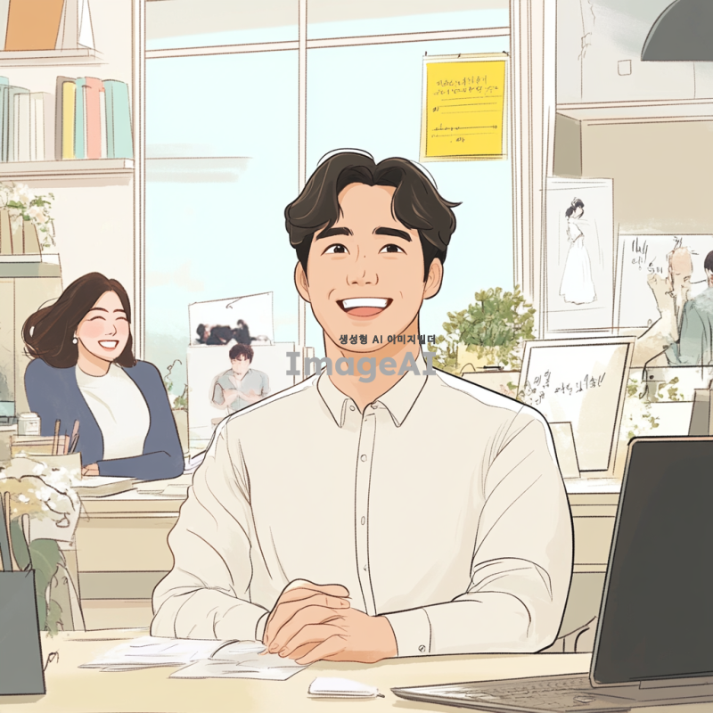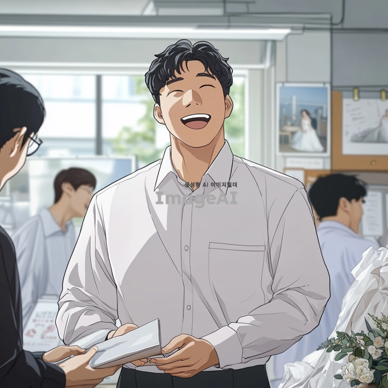 사무실에서 일하고 있는 한국인 남성이 결혼에 대한 생각이 없다는 내용을 담은 장면. 그는 동료들과 함께 웃으며 대화하고 있고, 주변에는 결혼식 사진이나 웨딩 관련 소품들이 있지만 그는 그에 대해 무관심한 표정을 짓고 있다. 배경은 현대적인 사무실 환경으로, 편안한 분위기를 연출한다.
