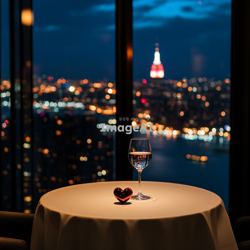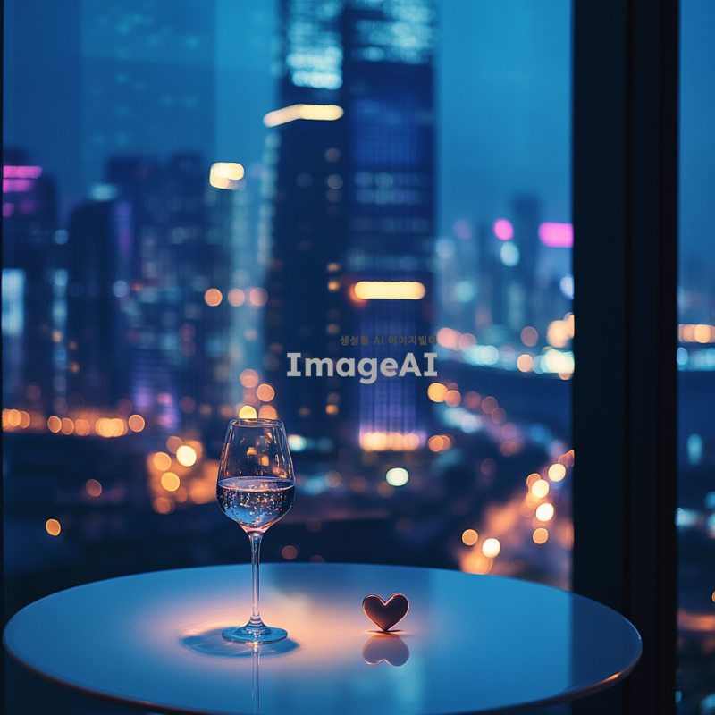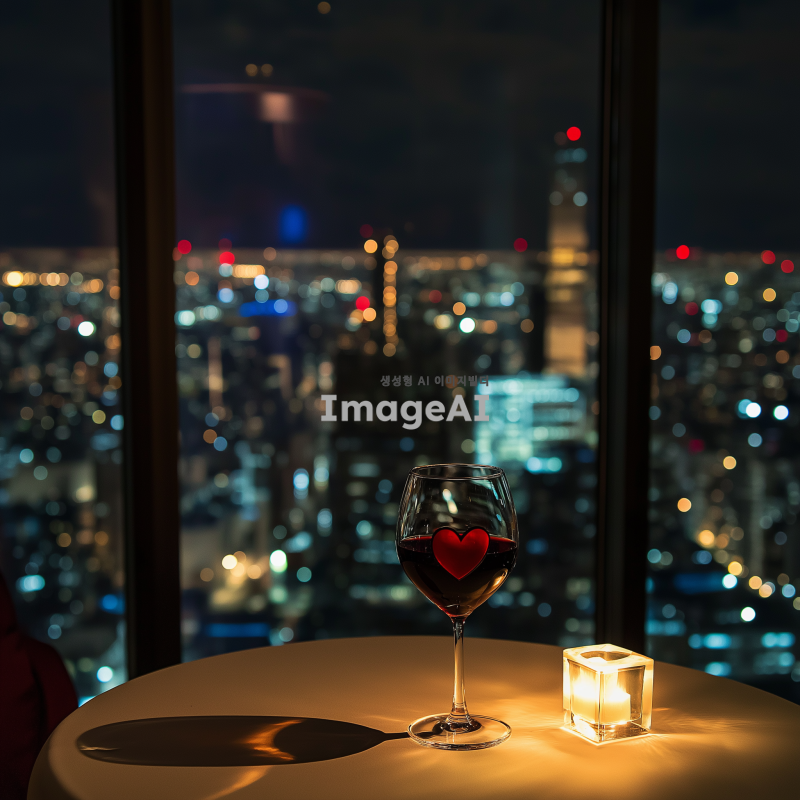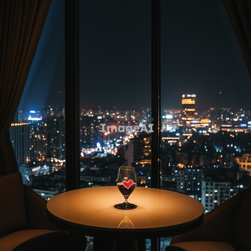밤의 도시 풍경이 불빛으로 반짝이는 모습, 통유리창을 통해 바라보이는 장면, 어두운 호텔 방 안에는 불이 꺼져 있고, 하얀 원형 테이블 위에는 심장이 담긴 와인잔이 놓여져 있는 모습.