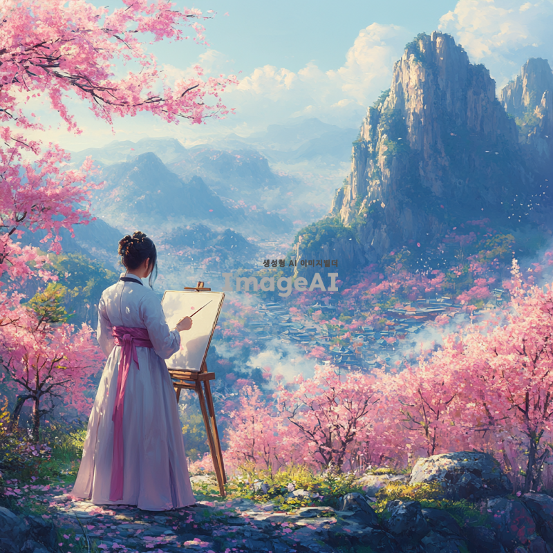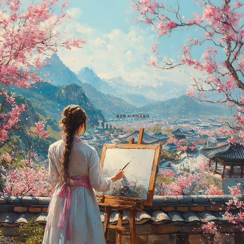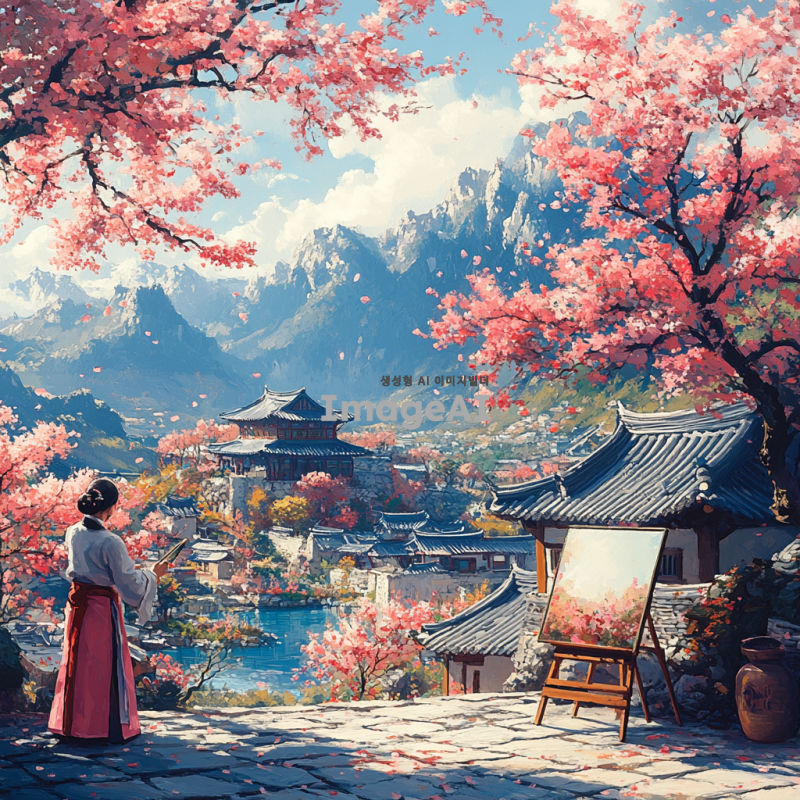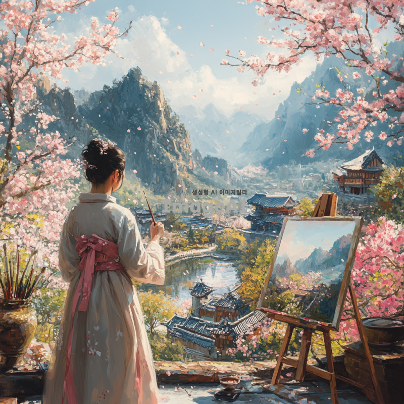 한국의 전통 풍경을 배경으로 한 화가가 캔버스 앞에 서서 그림을 그리는 모습. 화가는 한복을 입고 있으며, 주변에는 아름다운 벚꽃이 만개해 있다. 화가의 표정은 집중하고 있으며, 손에는 붓을 들고 있다. 하늘은 맑고 푸르며, 따뜻한 햇살이 비추고 있다. 그림의 색감은 생동감 넘치고, 전통적인 한국의 미를 잘 표현하고 있다.