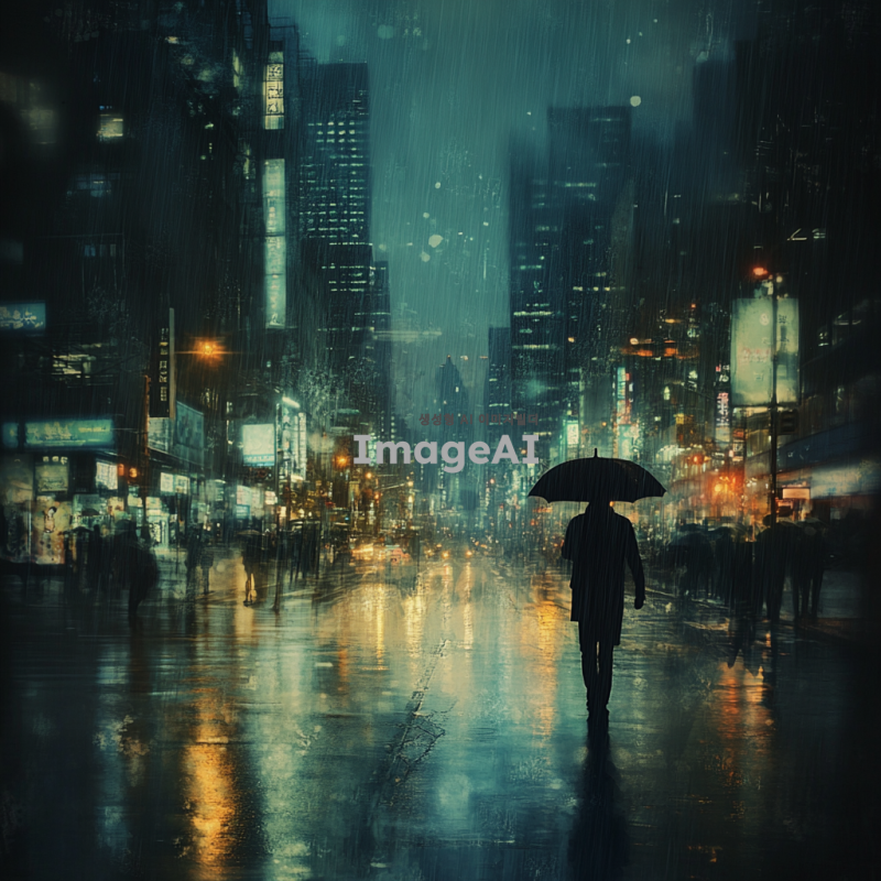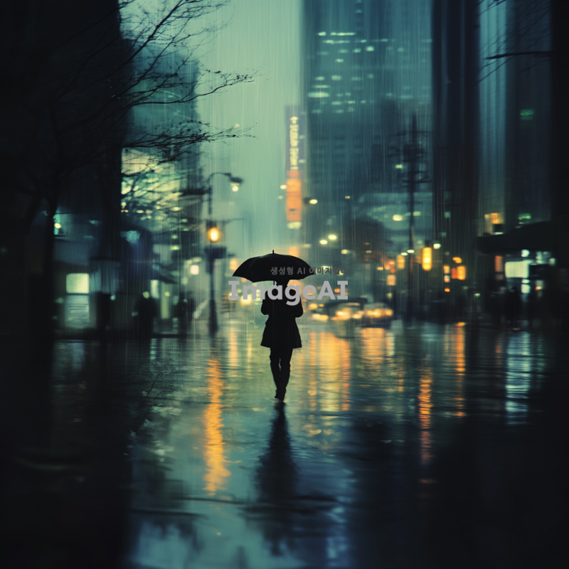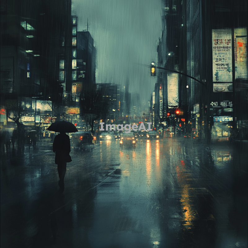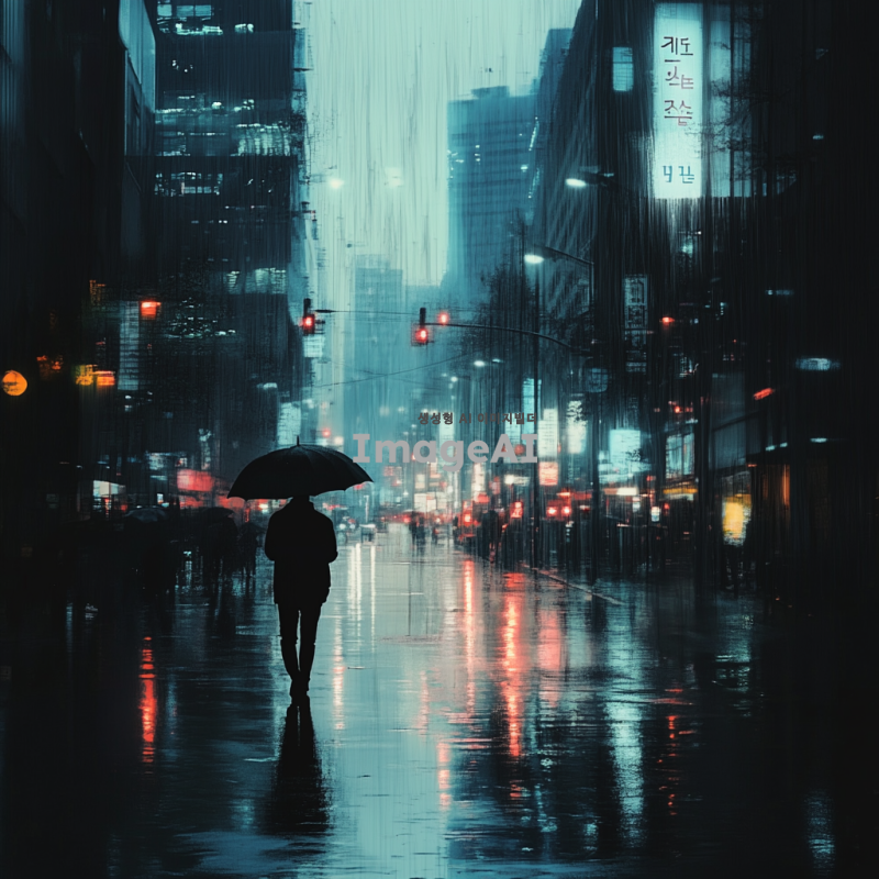어두운 분위기의 한국 도시 풍경, 비 오는 날, 고독한 인물이 우산을 쓰고 거리를 걷고 있는 모습, 흐릿한 조명과 함께 우울한 감정을 표현, 차가운 색조의 이미지, 배경에 흐릿하게 보이는 고층 건물들과 가로등의 빛, 감정적으로 고립된 느낌 강조.