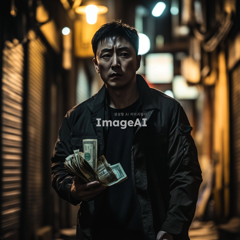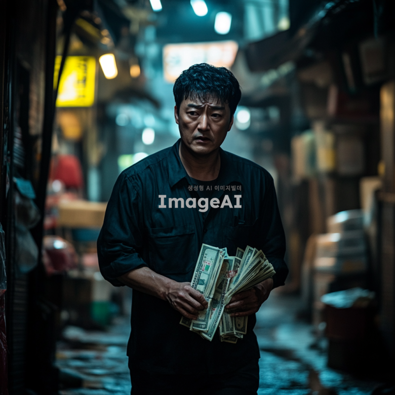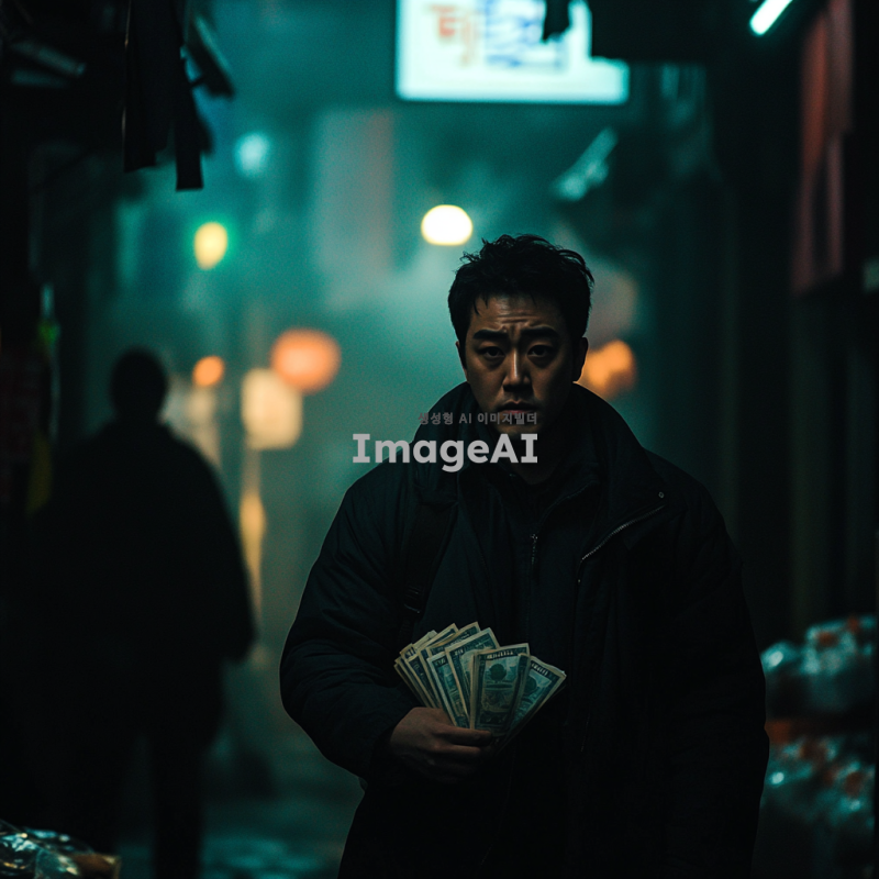 어두운 골목길을 걷고 있는 한국인 남성, 손에 돈다발을 쥐고 있지만 불안한 표정을 짓고 있는 모습, 주변은 음산한 분위기로 가득 차 있고, 그 남성의 시선은 주위를 경계하는 듯한 느낌, 배경에는 불빛이 희미한 가로등과 그림자가 드리워진 벽, 돈의 무게와 불안함을 동시에 느끼게 하는 장면.