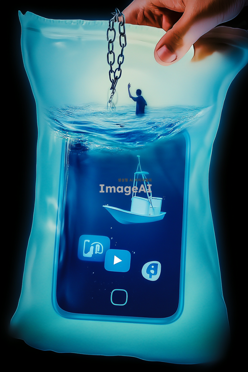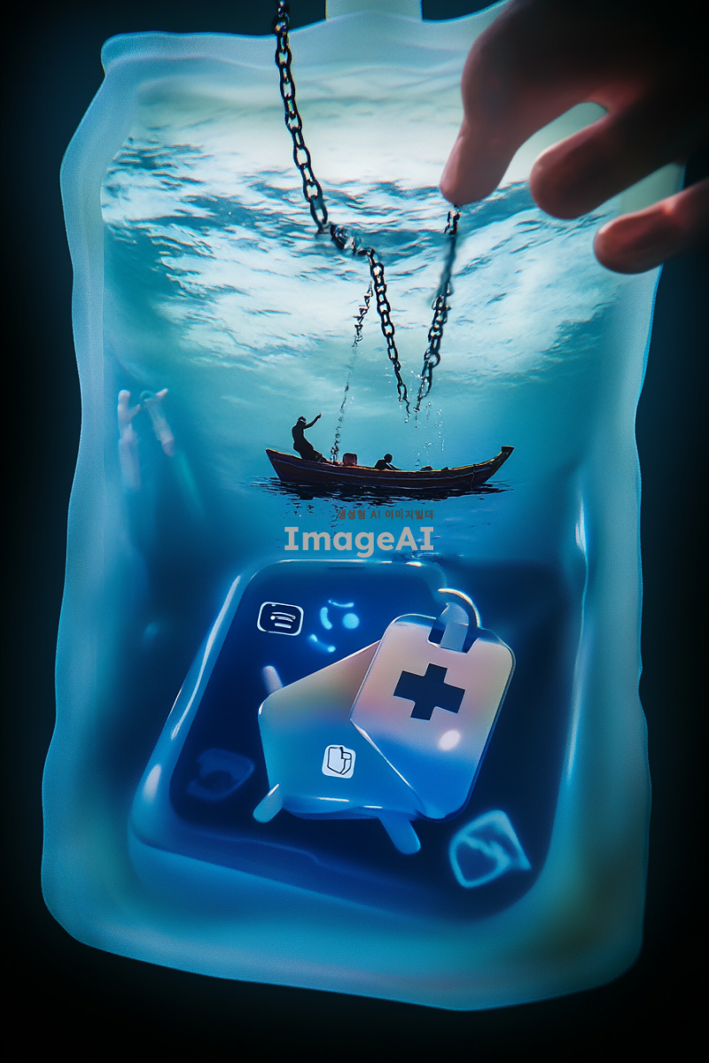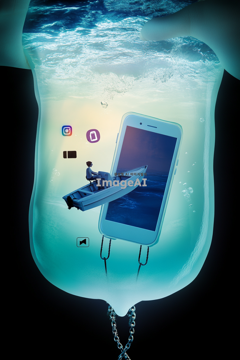 링거 팩 속에 물이 반 쯤 들어가 있고 물 위에 떠있는 반 쯤 가라앉고 부서진 작은 배, 하지만 그 위에 탄 사람은 그 사실을 인지하지 못한 채 운전 중, 또한 물 아래에는 3개의 아이콘(인스타, 유튜브, 틱톡)이 있음 이3개의 아이콘은 링거팩을 스마트폰처럼 보이게 하는 효과를 주며 배와 연결된 체인으로 배가 가라앉는 원인이 3개의 아이콘 때문임을 알 수 있음 하지만 이를 부정하기 위한 바깥 존재의 손이 링거팩을 각지게 하여 배가 일반적으로 있는 것 처럼 보이게 함. 이를 통해 스마트폰 과의존에 대한 위험성을 나타냄