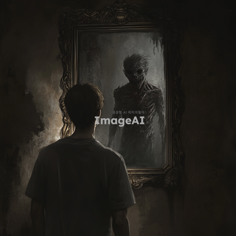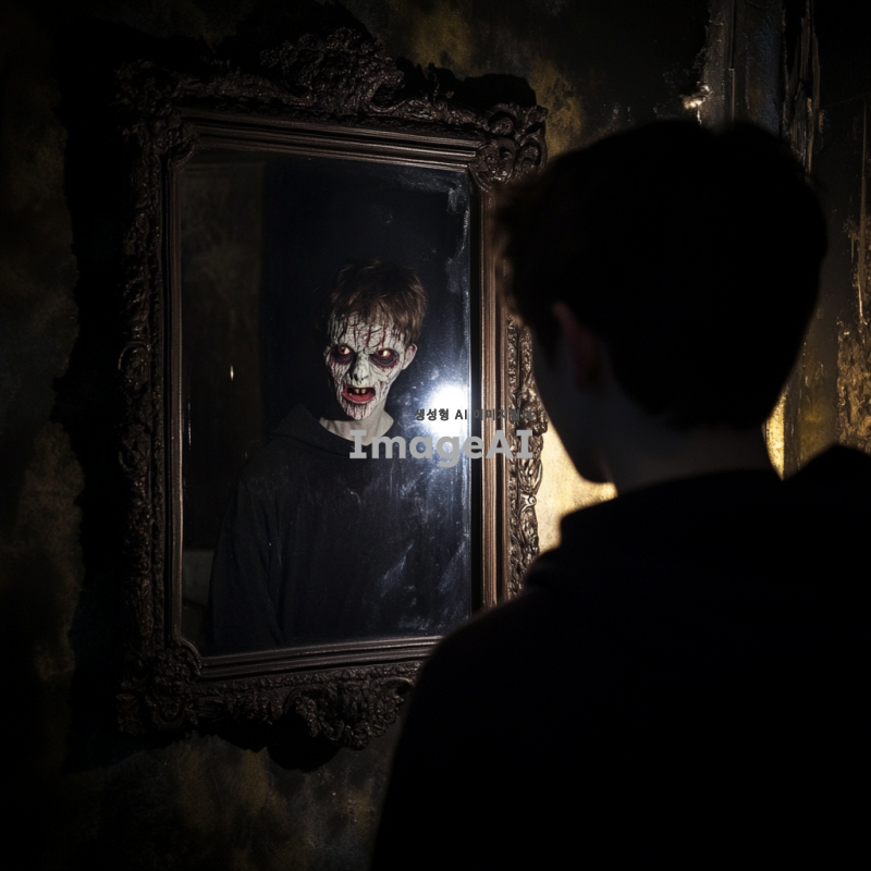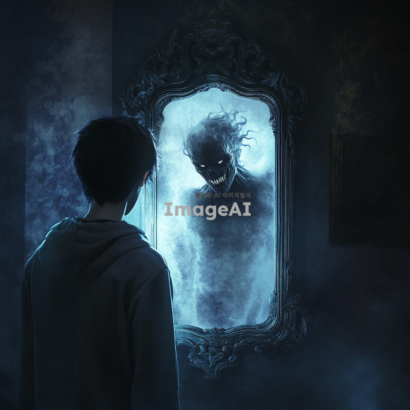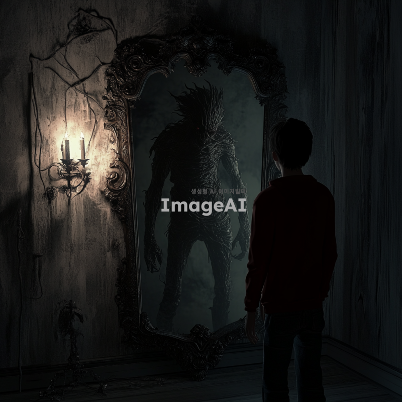한 청소년이 거울 앞에 서서 자신의 모습을 바라보고 있지만, 거울 속에는 괴물의 형태가 비춰지는 장면. 청소년은 놀라움과 두려움이 섞인 표정을 짓고 있으며, 거울의 테두리는 고풍스러운 디자인으로 장식되어 있다. 어두운 방 안에서 희미한 빛이 거울을 비추고 있어 신비로운 분위기를 자아내고 있다.