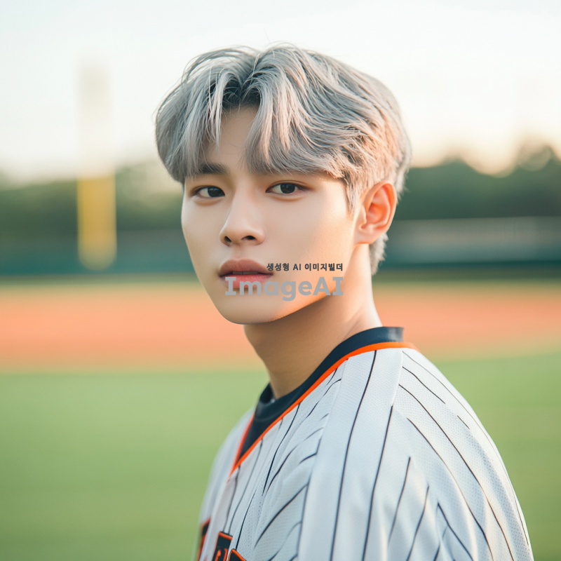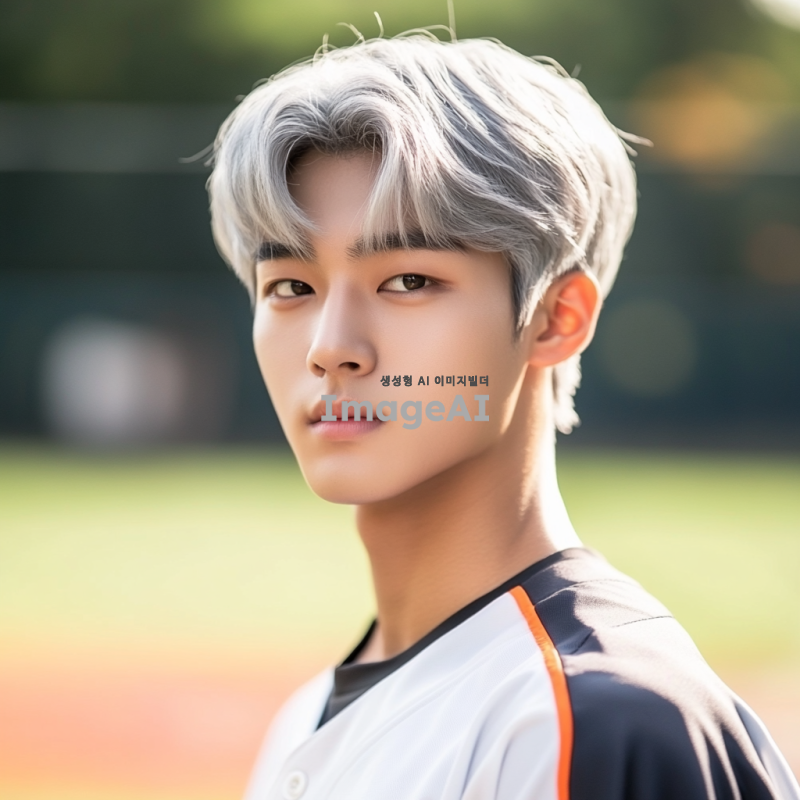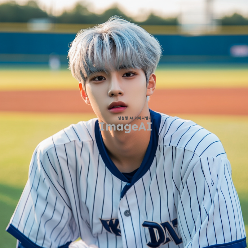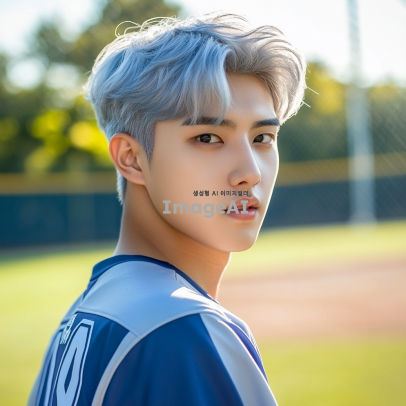 고등학교 야구부 유니폼을 입고 있는 잘생긴 한국인 남학생, 은발의 매력적인 외모, 자연스러운 포즈, 배경은 야구장, 밝고 생동감 있는 분위기, 스포츠에 대한 열정이 느껴지는 모습.