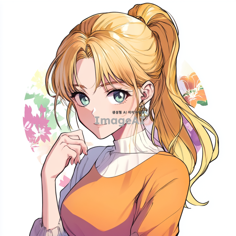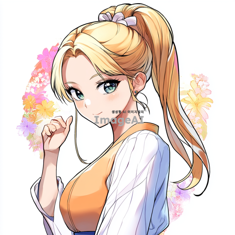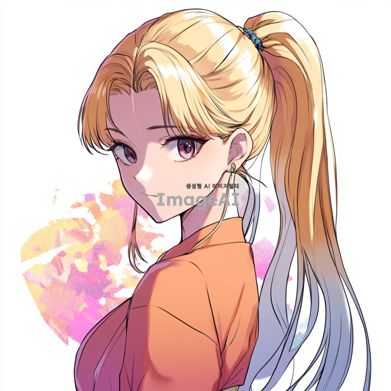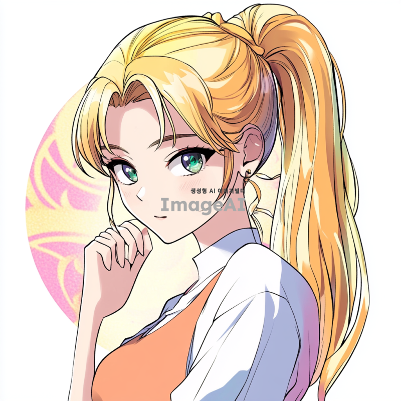 포니테일로 묶은 금발 머리의 젊은 여성의 만화 스타일 초상화. 복장은 살구색 한복을 입고있다 배경은 애니메이션 스타일의 다채로운 색상으로, 이미지는 깨끗한 흰색 배경에 고립되어 있다.