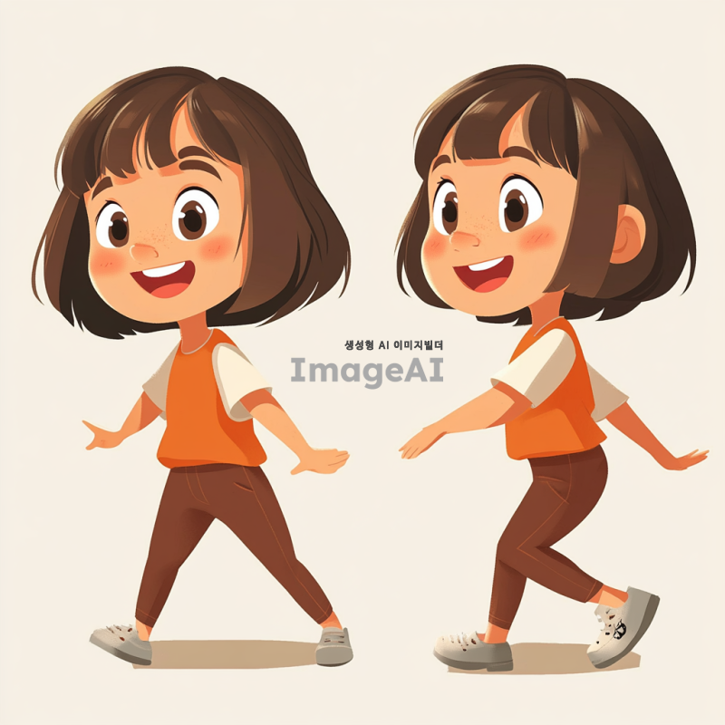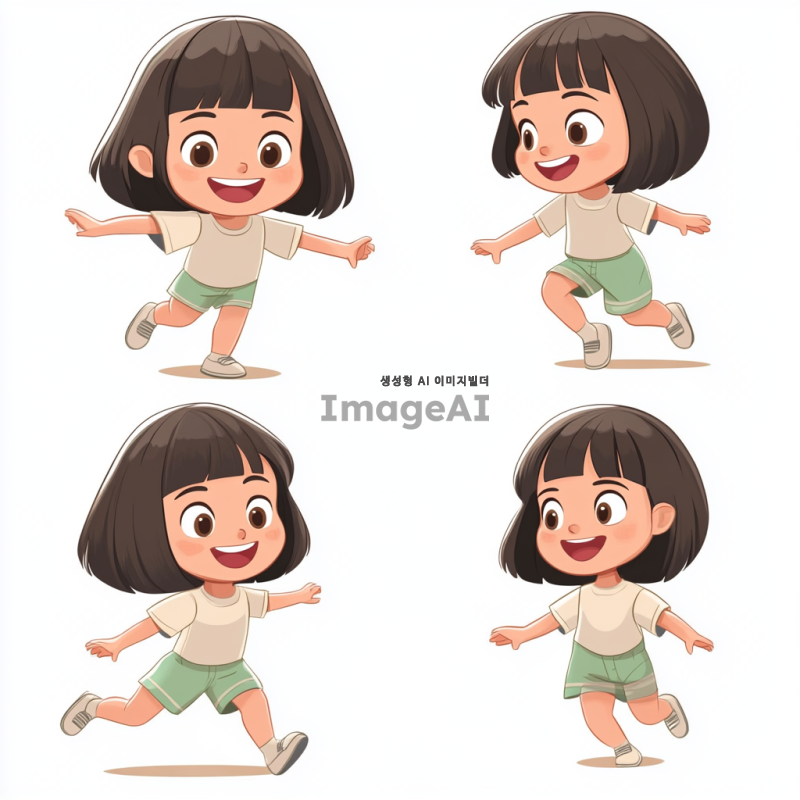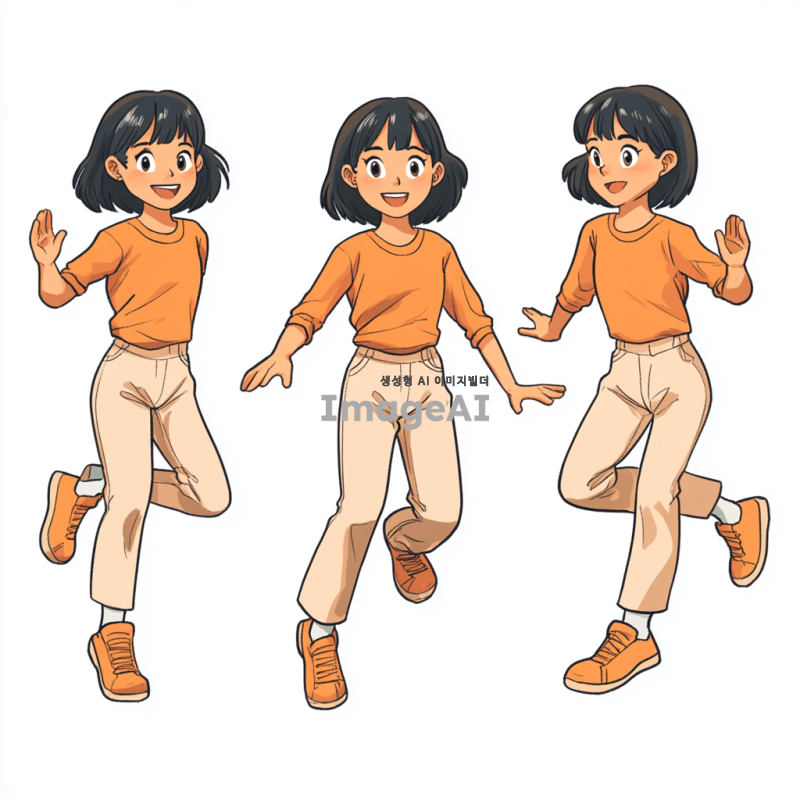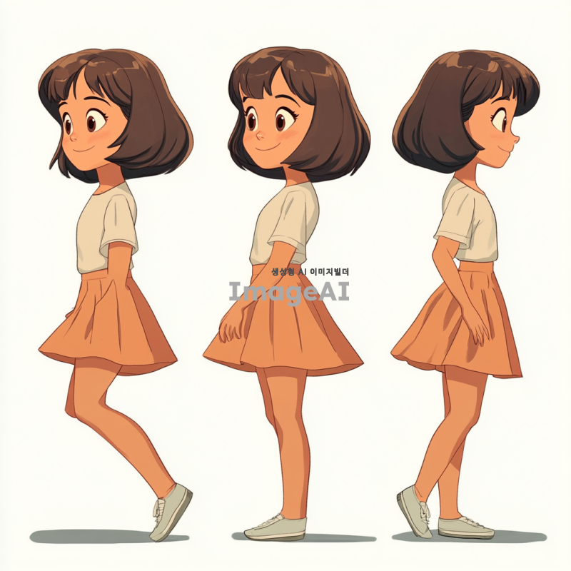2D 단발머리 여자아이를 머리부터 발끝까지 정면에서 바라본 모습, 완전 측면에서 바라본 모습, 반측면에서 바라본 모습으로 각각 다른 동작을 하는 이미지. 정면에서는 활짝 웃는 모습, 완전 측면에서는 뛰어가는 모습, 반측면에서는 앉아있는 모습으로 표현