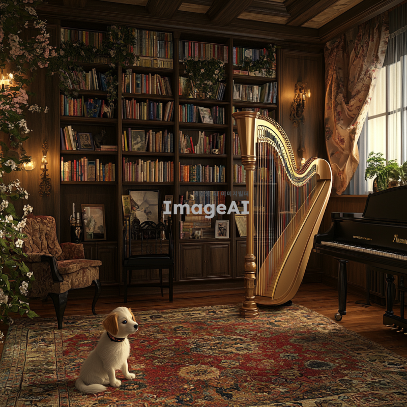 러블리한 방 안, 다양한 책들이 가득한 책장, 귀여운 강아지가 옆에 앉아 있는 모습, 한쪽에는 아름다운 하프와 피아노가 놓여 있는 아늑한 공간, 따뜻한 조명이 비추는 편안한 분위기, 색감이 풍부하고 감성적인 느낌의 인테리어.