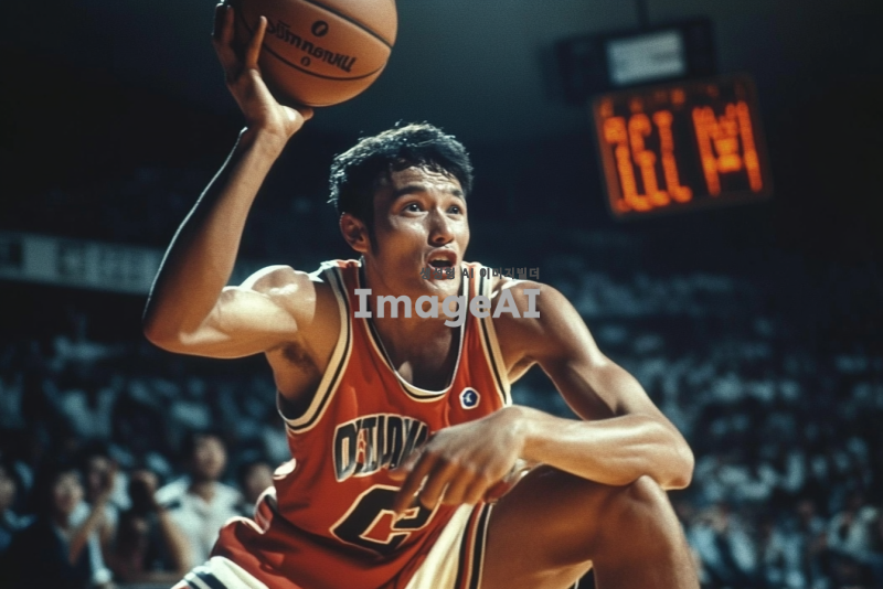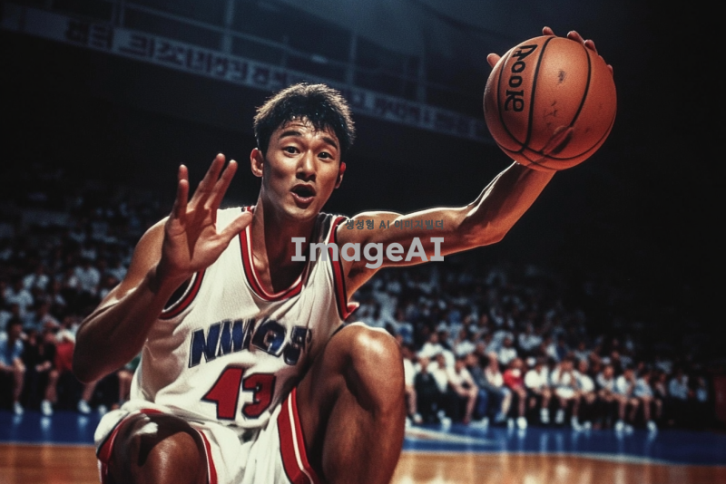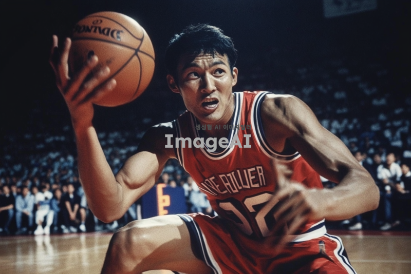 한국의 농구선수가 코트에서 드리블을 하며 점프슛을 시도하는 모습, 뒷 배경에는 관중들이 가득 차 있는 농구 경기장, 선수는 팀 유니폼을 입고 있으며, 강렬한 표정과 역동적인 자세로 운동의 긴장감을 표현하고 있음.