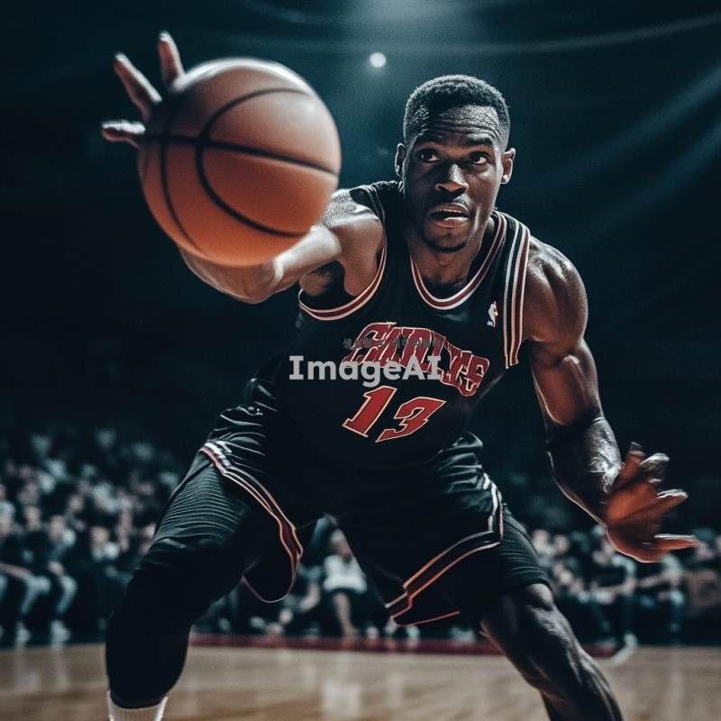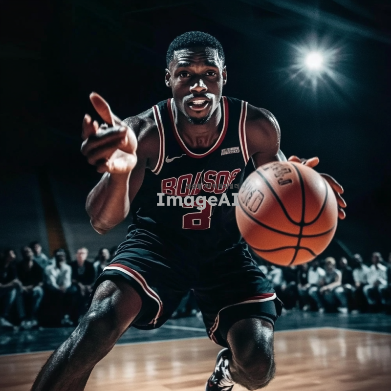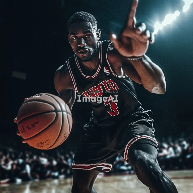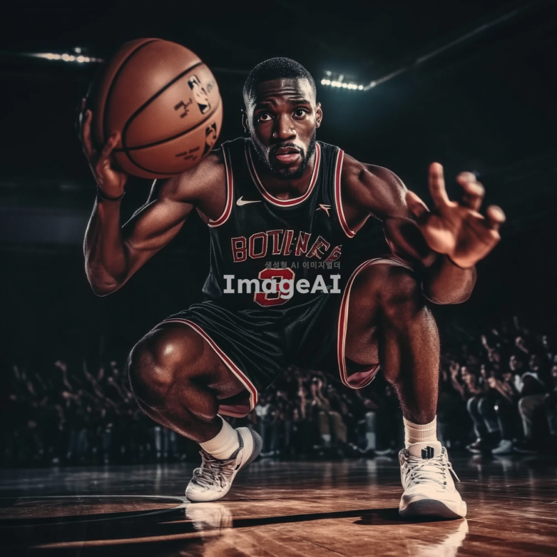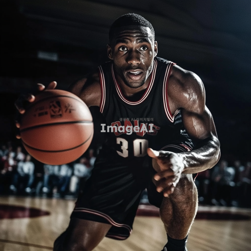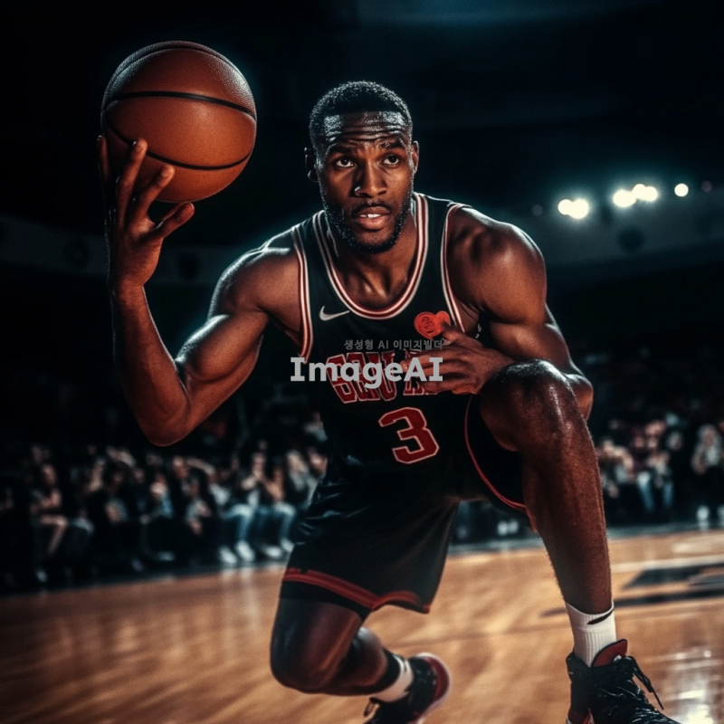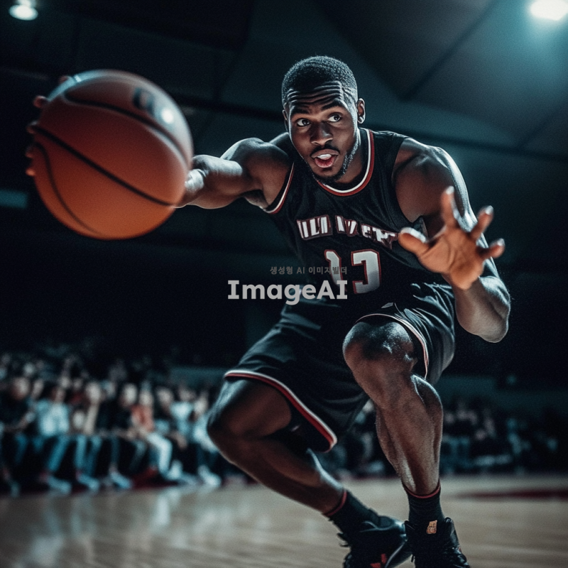 검은색 농구 유니폼을 입고 있는 흑인 남성 농구선수가 역동적으로 드리블하는 모습. 배경은 농구 코트로, 관중들이 응원하는 모습이 보인다. 선수의 표정은 집중하고 있으며, 근육질의 몸매가 잘 드러나도록. 조명은 코트 위에 집중되어 있고, 공중에서 농구공이 날아가는 장면을 포착.