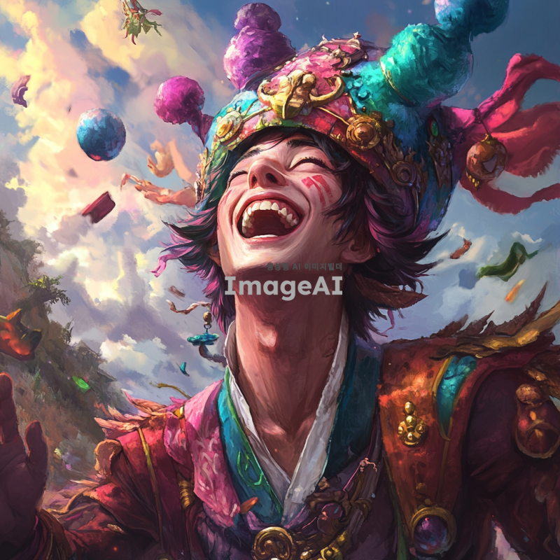 라바돈의 죽음모자를 쓴 한국인 리신이 병맛스럽게 웃고 있는 모습, 화려한 색감과 과장된 표정, 귀여운 스타일로 그려진 리신, 배경은 만화 같은 느낌의 환상적인 풍경, 유머러스한 요소가 가득한 장면.