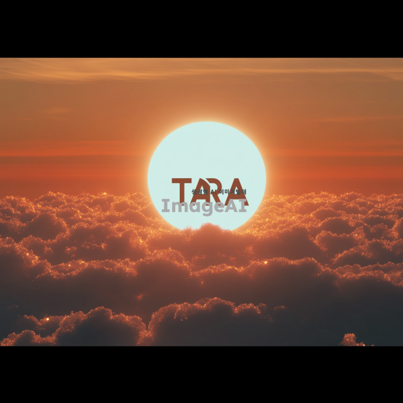떠오르는 해를 배경으로, 'tara' 회사 로고가 중앙에 자리잡고 있는 이미지. 해는 밝고 따뜻한 색조로 표현되며, 부드러운 구름이 주변을 감싸고 있다. 로고는 현대적이고 세련된 디자인으로, 해의 빛을 받아 반짝이는 모습. 전체적으로 희망적이고 긍정적인 느낌을 주는 장면. 그리고 건강한 미래가 올것같은 활기찬 이미지로