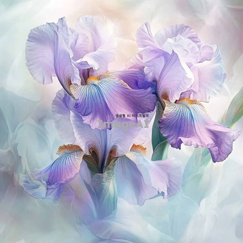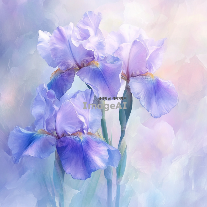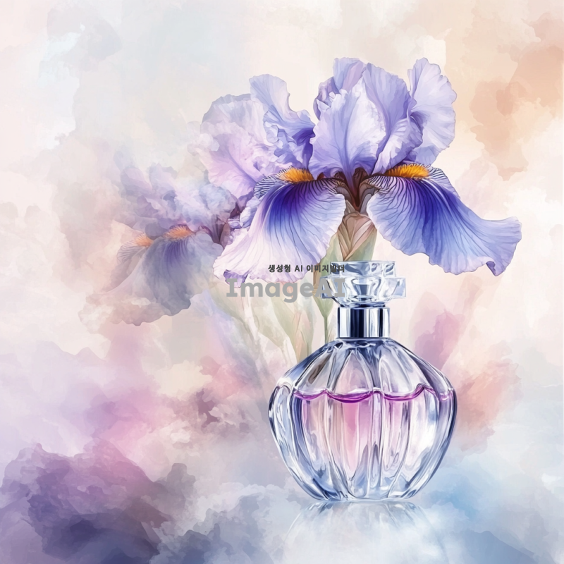 붓꽃이 만개한 모습이 수채화 스타일로 표현된 그림, 부드러운 색감과 흐릿한 경계선, 자연의 아름다움을 강조하며 향수 용기에 잘 어울리도록 디자인된 이미지.