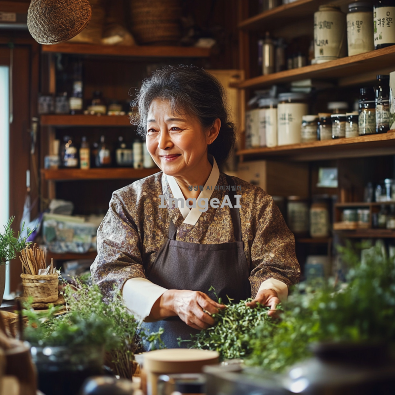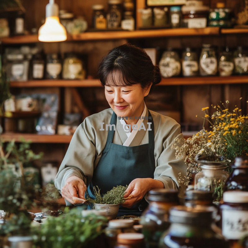 복순이네 약초이야기의 따뜻한 분위기를 담은 이미지, 한국의 전통 약초를 판매하는 작은 가게의 내부 모습, 다양한 약초와 한약재가 진열된 선반, 자연광이 들어오는 아늑한 공간, 복순이라는 이름의 중년 여성 주인이 약초를 손질하고 있는 모습, 전통 한복을 입고 미소 짓고 있는 모습, 주변에 자연을 느낄 수 있는 식물들, 편안하고 친근한 느낌의 색감.