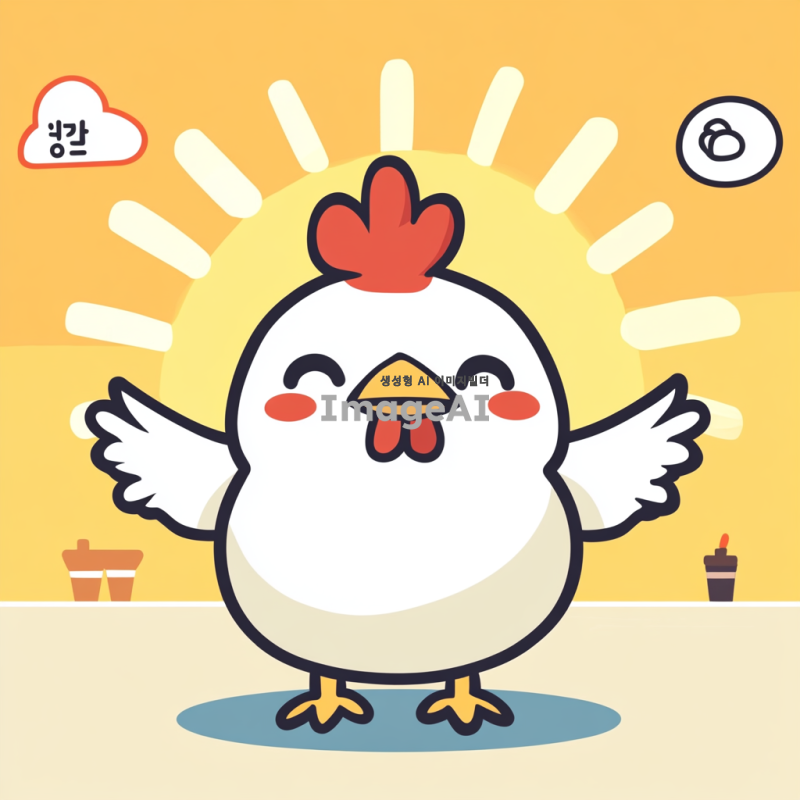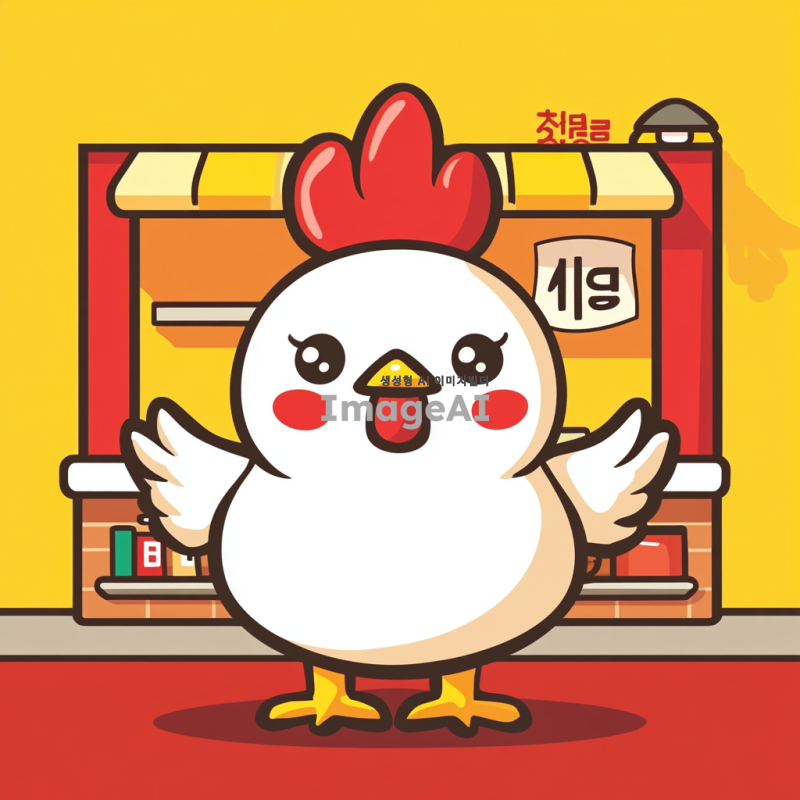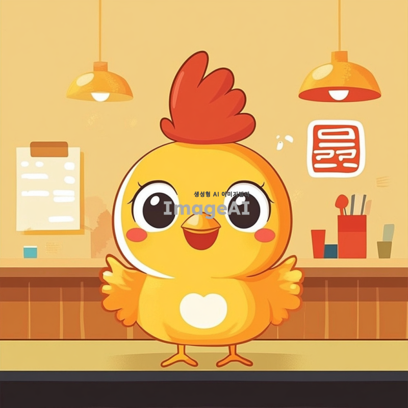 90도 인사하는 한국인 치킨 캐릭터, 귀여운 표정, 밝고 따뜻한 색감, 배경은 간단한 식당 환경, 치킨이 인사하는 모습 강조, 아기자기한 스타일