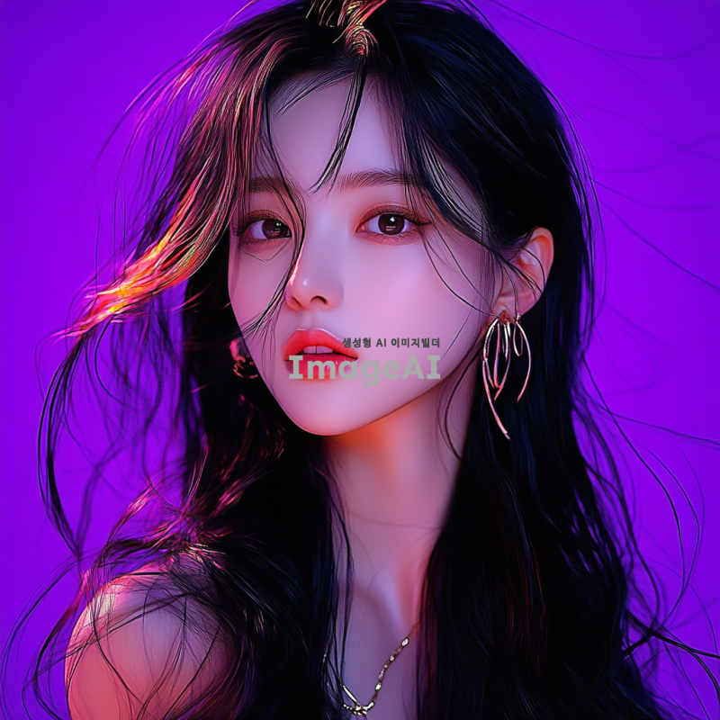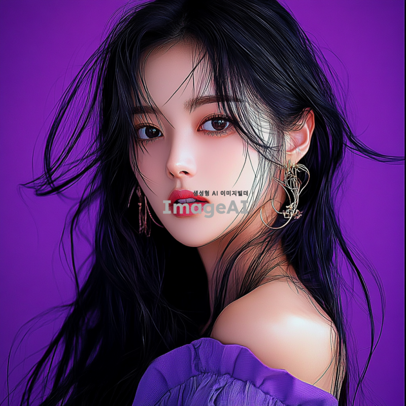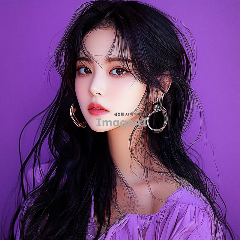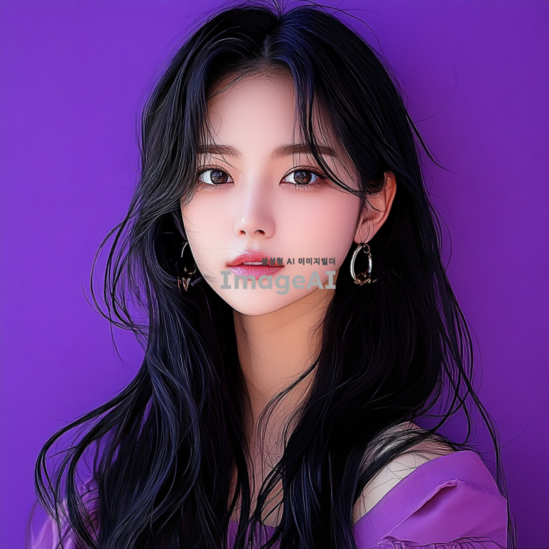 보라색 배경에 검은색 긴 머리를 가진 아름다운 한국 여성의 초상, 부드러운 표정과 우아한 포즈, 자연스러운 조명, 세련된 스타일의 의상, 꿈같은 분위기.