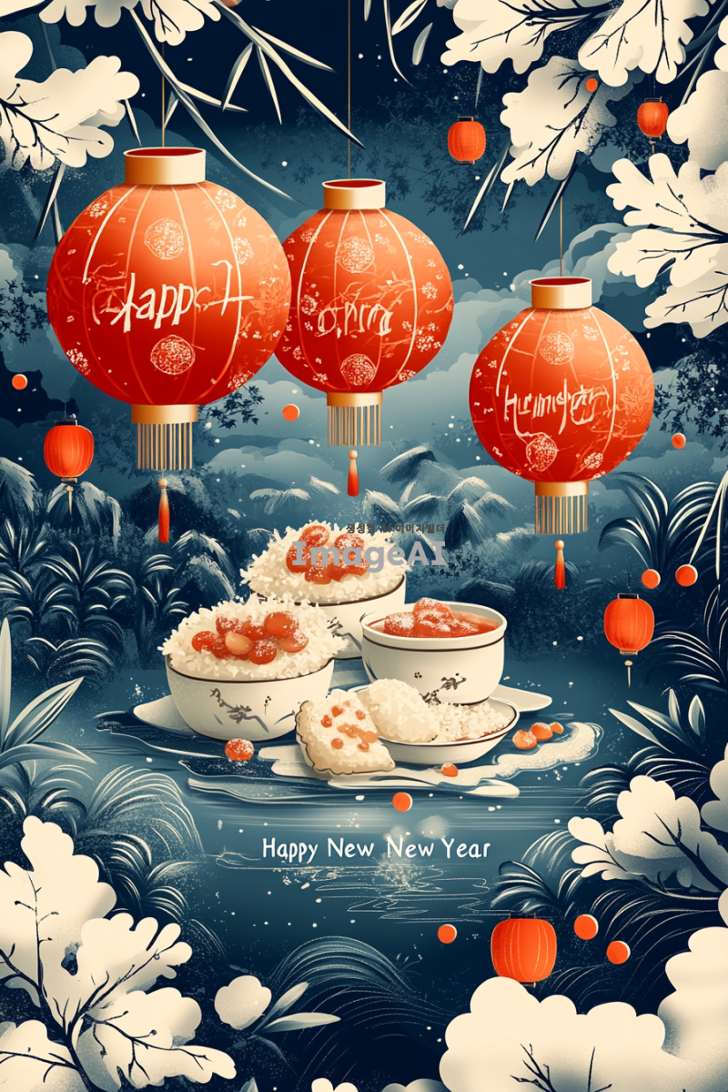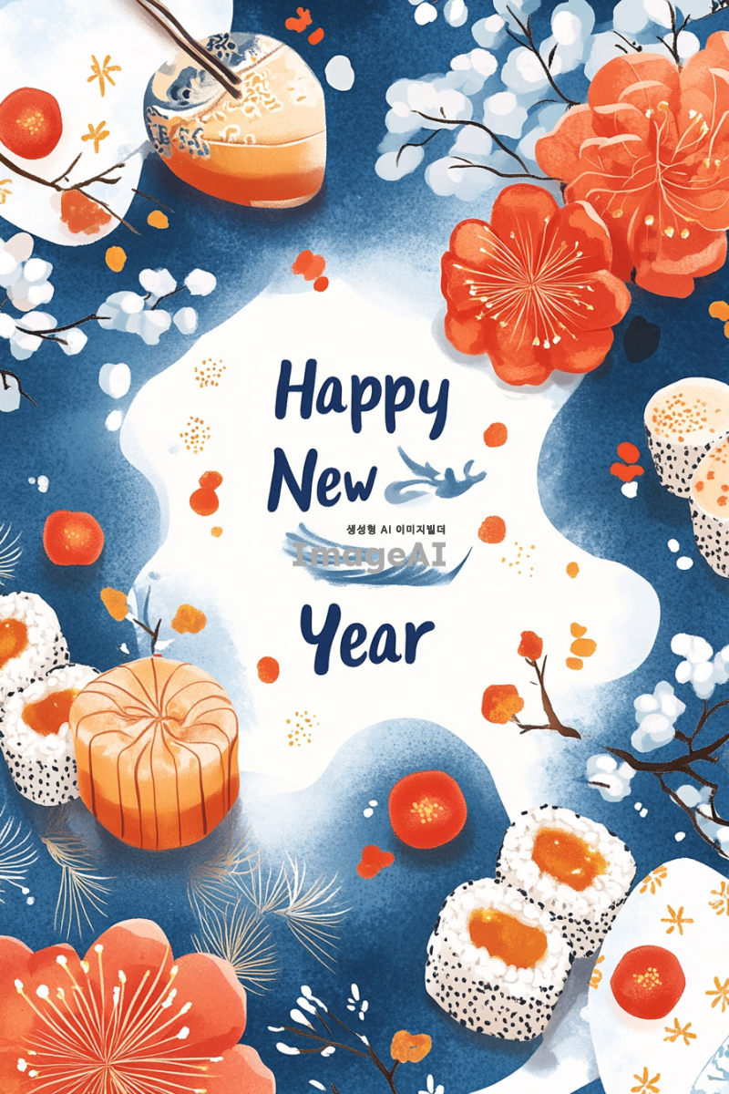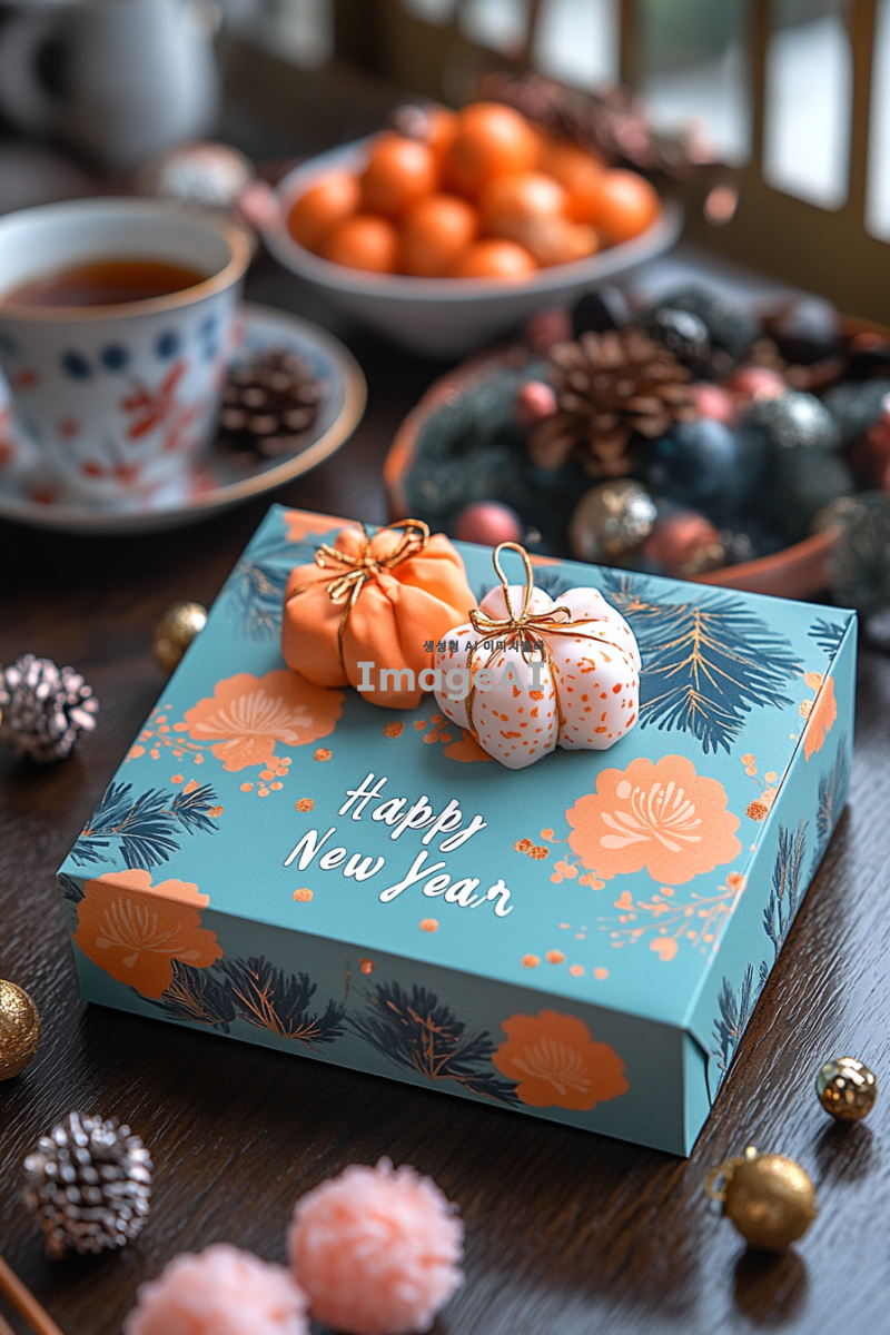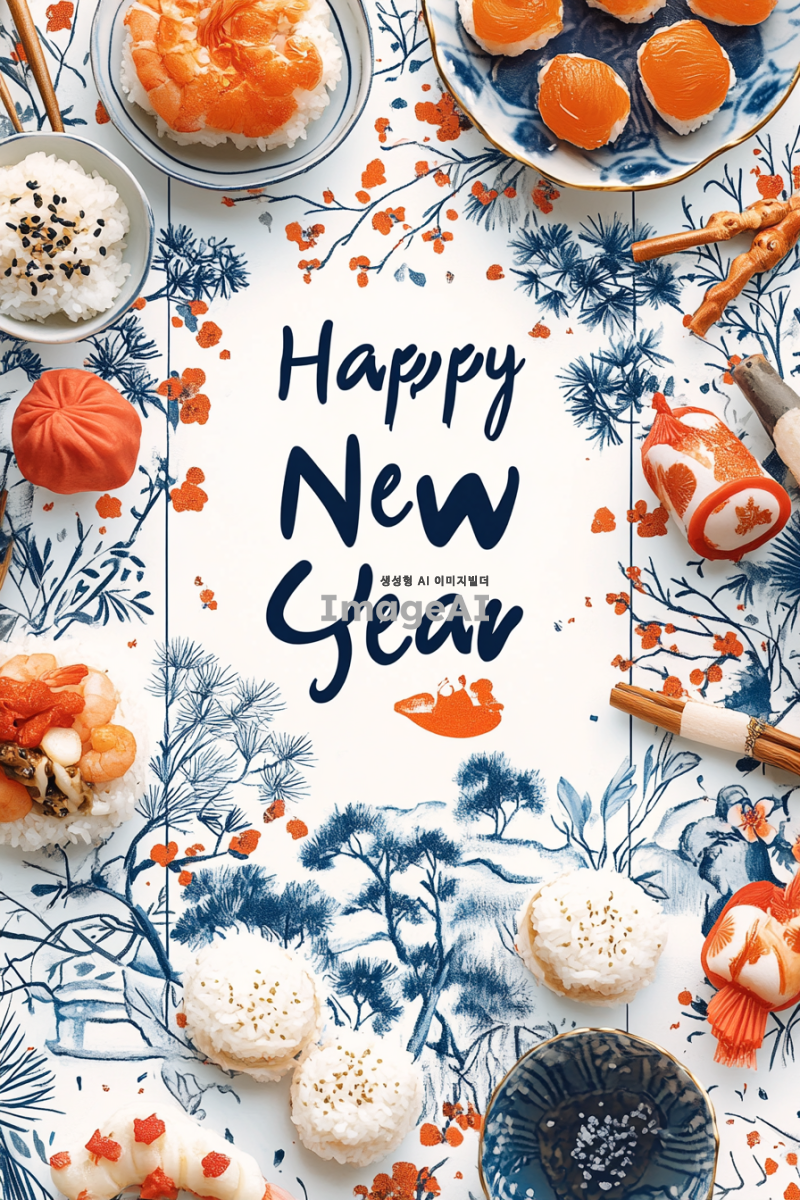 2025년 새해를 맞이하여 관세법인에서 작성한 느낌으로 각 고객사에게 전달할새해 인사 카드 디자인. 차분한 색감의 배경에 관세법인의 느낌나는 문양과 "새해 복 많이 받으세요"라는 문구가 적혀있고, 주변에는 새해를 상징하는 복주머니와 떡국이 그려져 있는 모습. 따뜻하고 희망적인 분위기를 강조하여, 가족과 친구들 및 고객사에게 전하고 싶은 따뜻한 메시지를 담고 있는 카드 디자인.