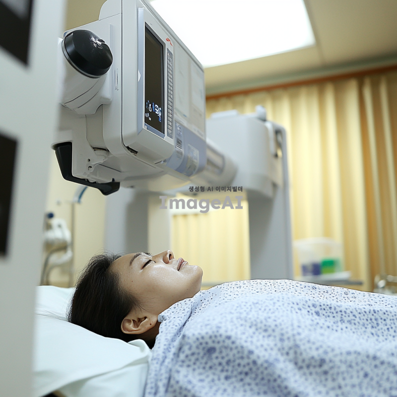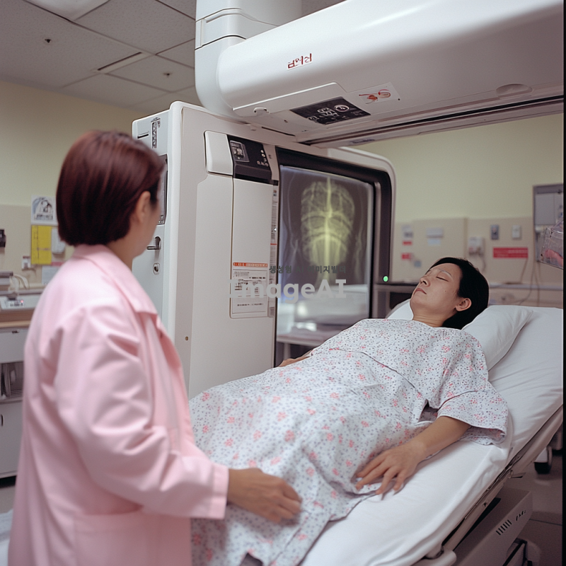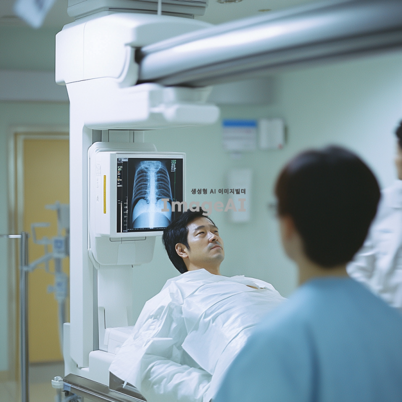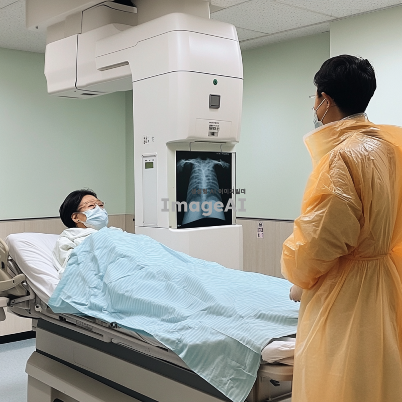 한국의 병원 환경에서 X-ray 검사를 받는 환자