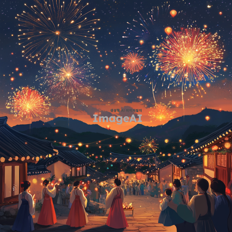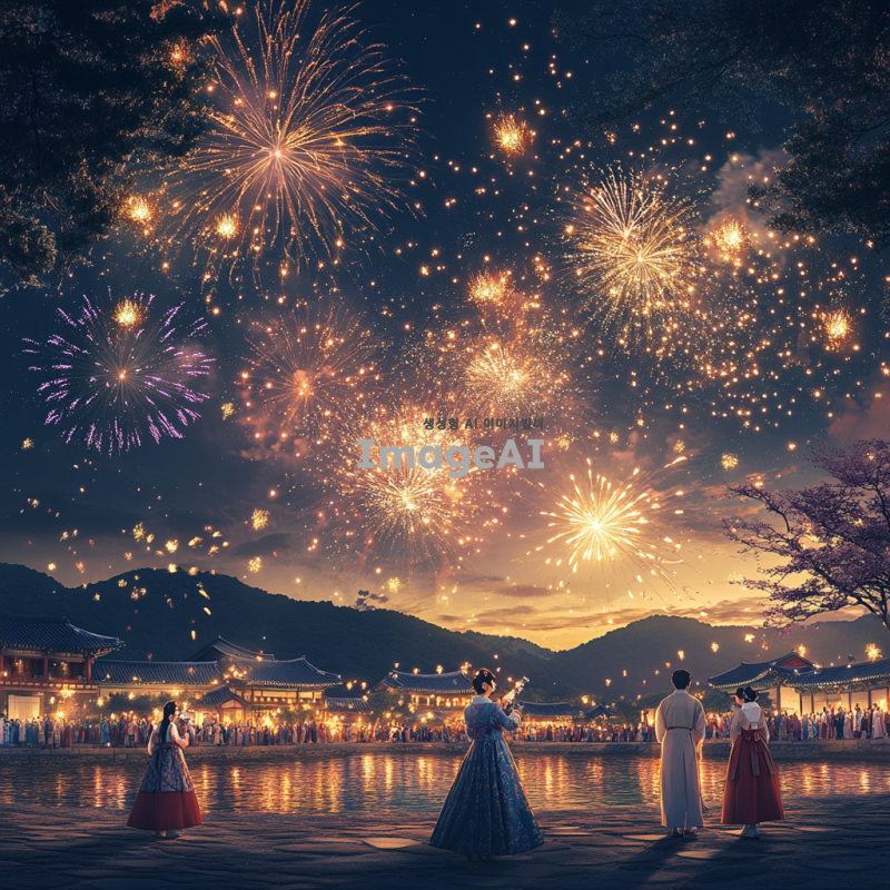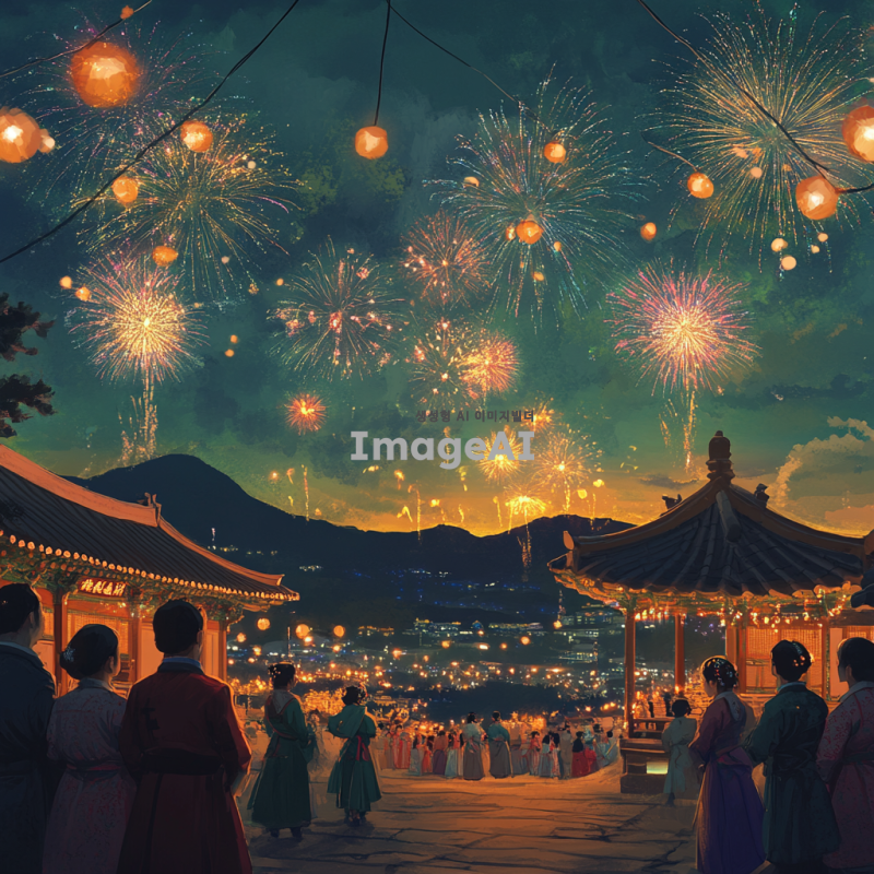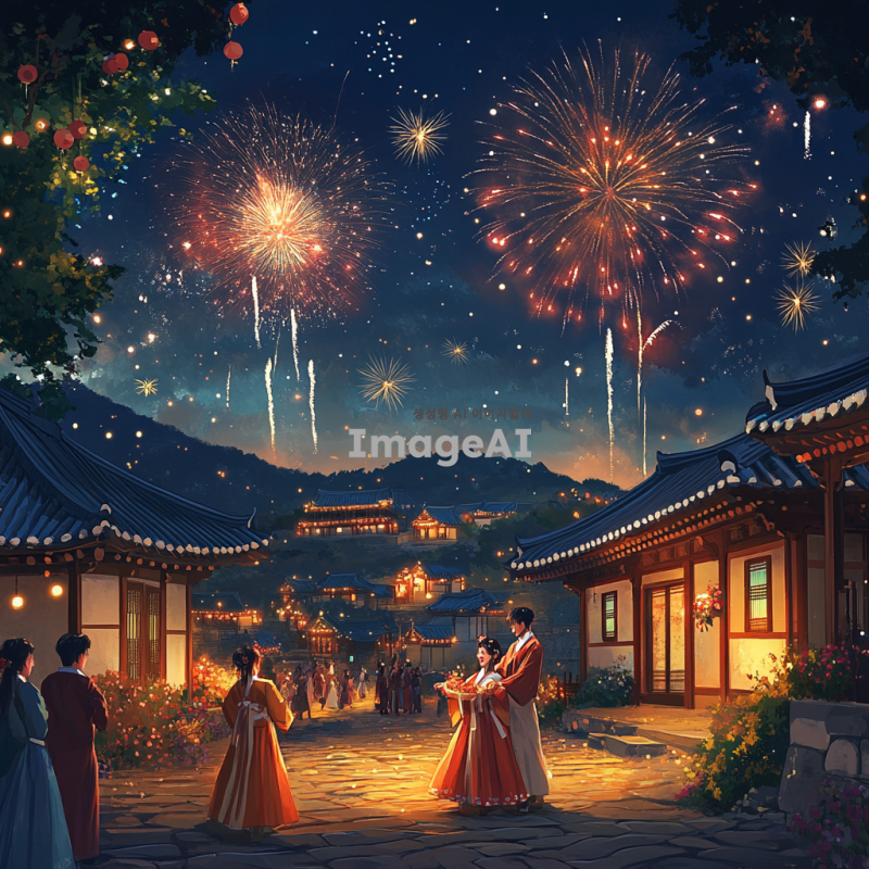2025년 새해를 맞이하여 한국의 전통적인 풍경 속에서 새해 인사를 전하는 모습, 화려한 불꽃놀이가 하늘을 수놓고, 사람들은 한복을 입고 서로 인사를 나누며 웃고 있는 장면, 따뜻한 분위기의 조명과 함께 새해의 희망과 기쁨이 가득한 이미지.