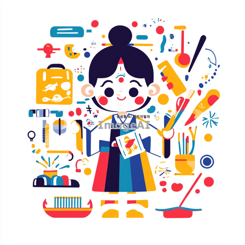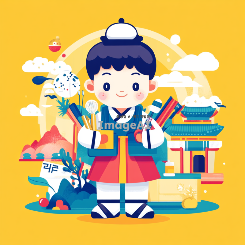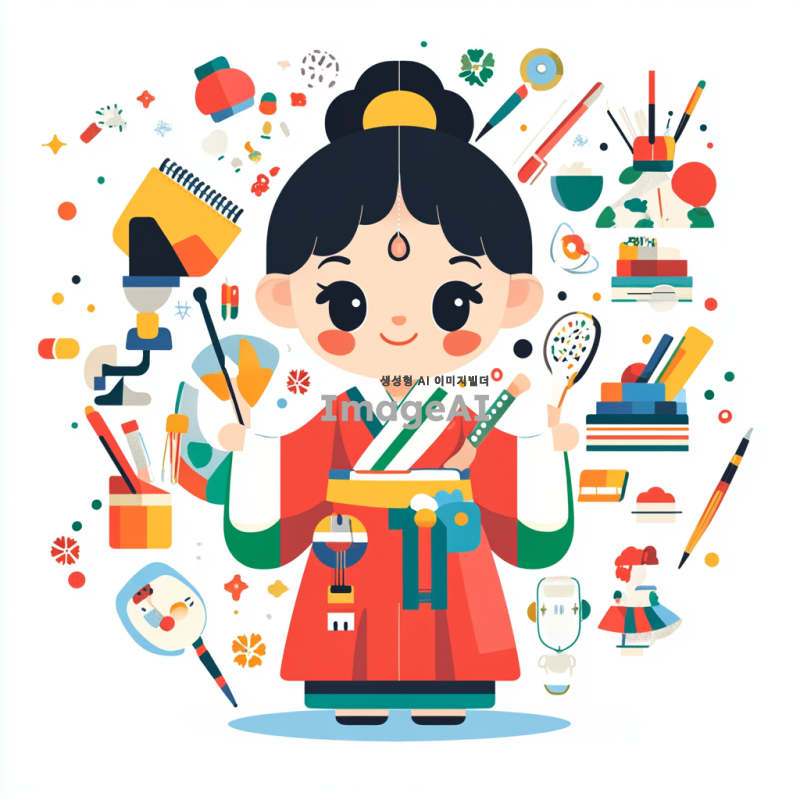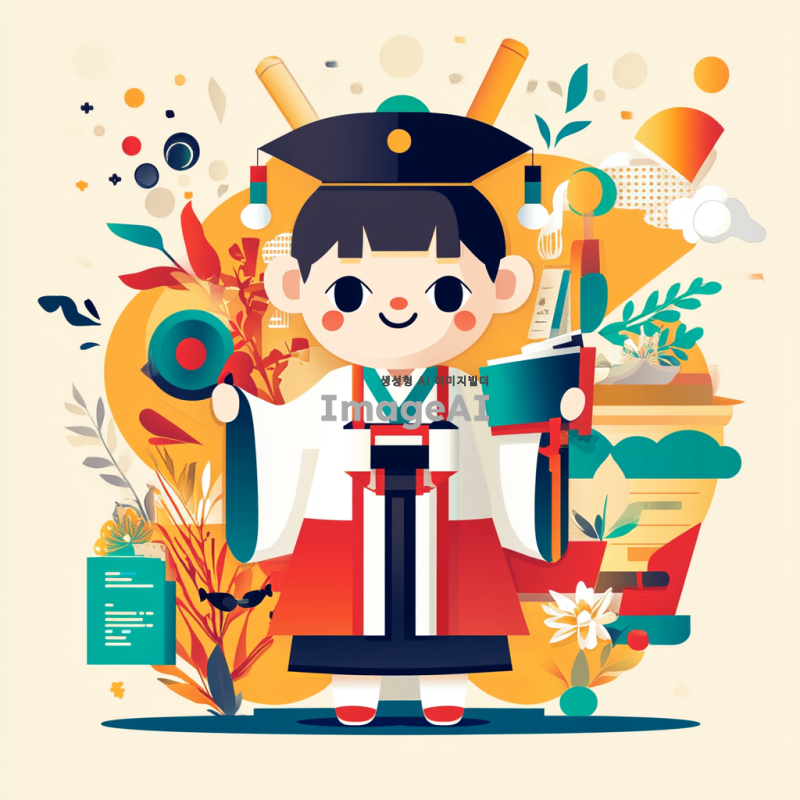 스마트인재개발원을 대표하는 귀엽고 현대적인 캐릭터 디자인. 한국의 전통 요소를 현대적으로 재해석한 스타일로, 밝고 경쾌한 색감이 돋보이며, 지혜롭고 친근한 인상을 주는 캐릭터. 다양한 학습 도구를 들고 있는 모습으로, 배경은 창의적인 학습 환경을 나타내는 요소들로 구성.