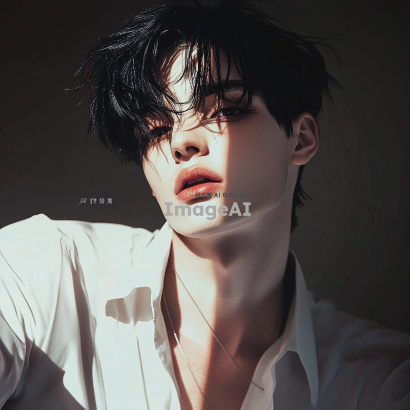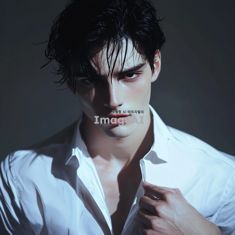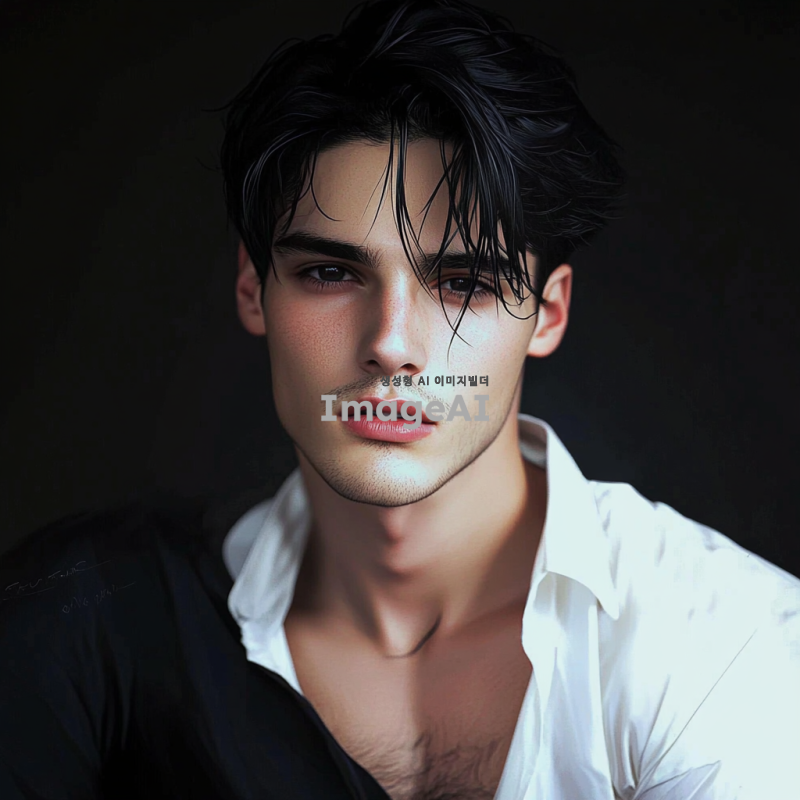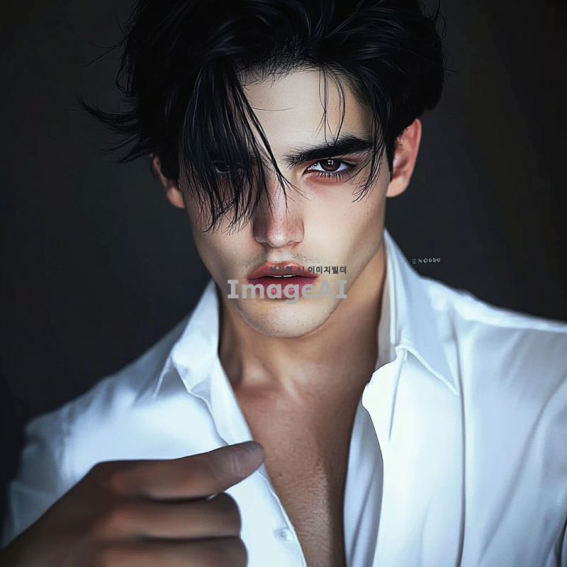 A man. A beautiful young man. Wearing a white shirt. Black hair. Black pupils. White skin. Skin visible through the shirt. Red lips. A sharp jawline. A high nose.