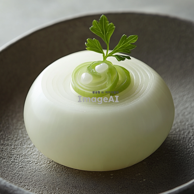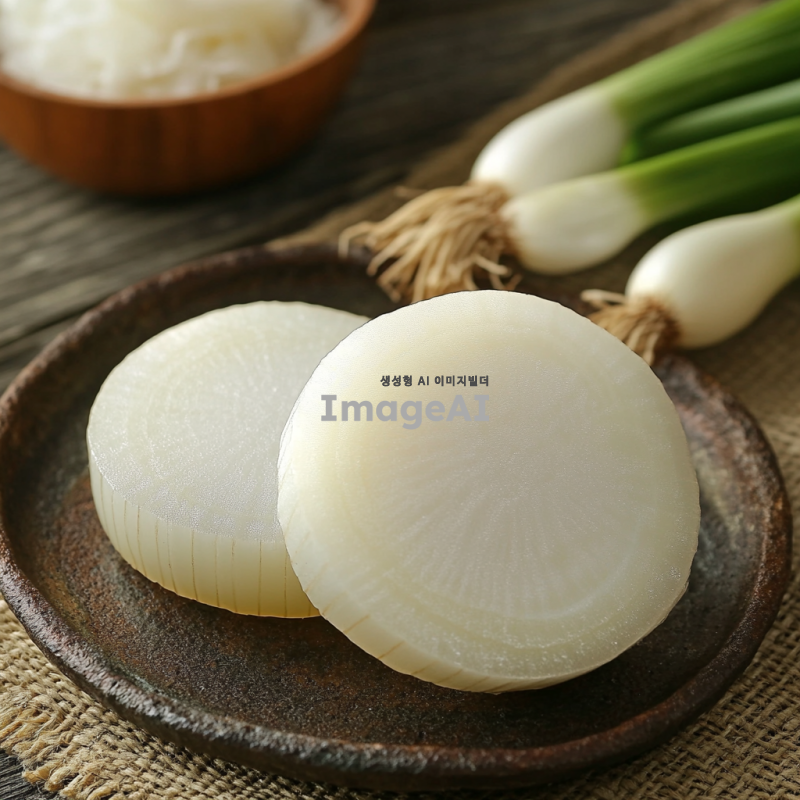 깨끗하고 매끈한 동그란 양파의 단면을 정밀하게 표현한 이미지, 부드러운 질감과 선명한 색상, 자연광이 비치는 배경, 식물의 신선함을 강조한 모습, 한국의 전통 요리와 어울리는 느낌