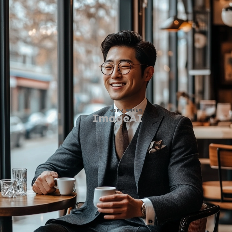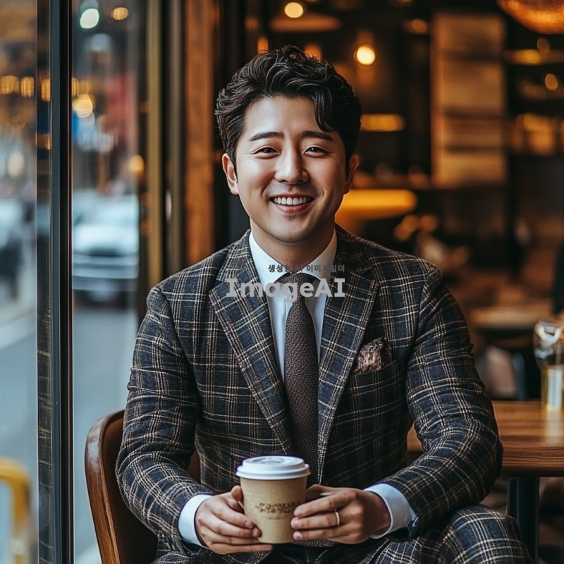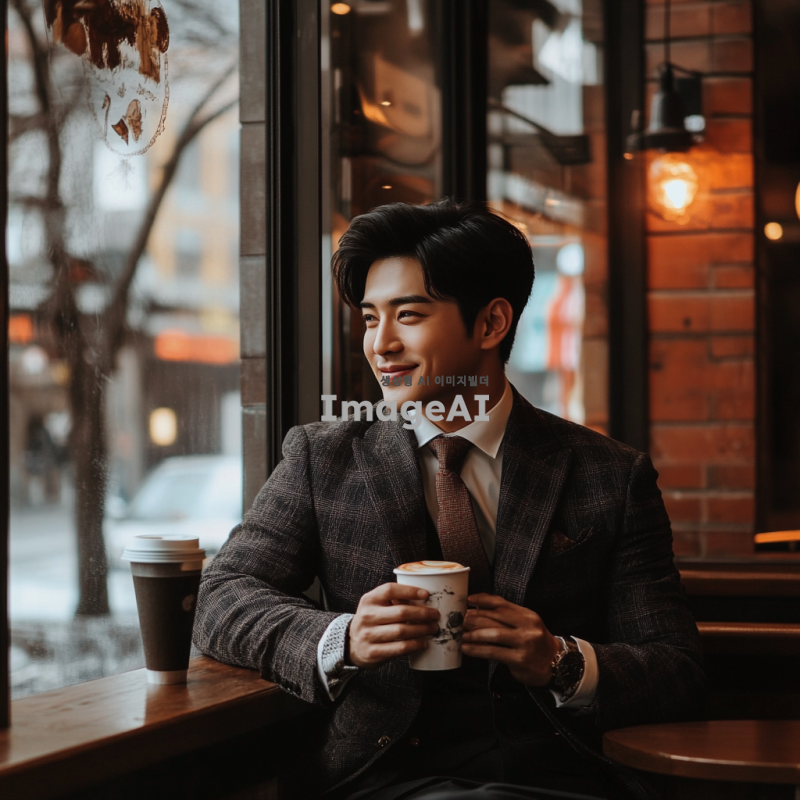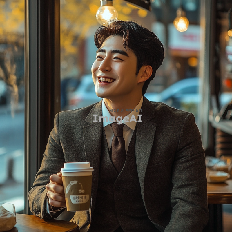 정장 스타일의 한국인 남성이 커피숍에서 앉아 있는 모습, 세련된 정장과 넥타이를 착용하고 있으며, 커피 잔을 들고 미소 짓고 있는 모습, 주변에 아늑한 인테리어와 따뜻한 조명, 창밖으로 보이는 거리 풍경이 보이는 장면.
