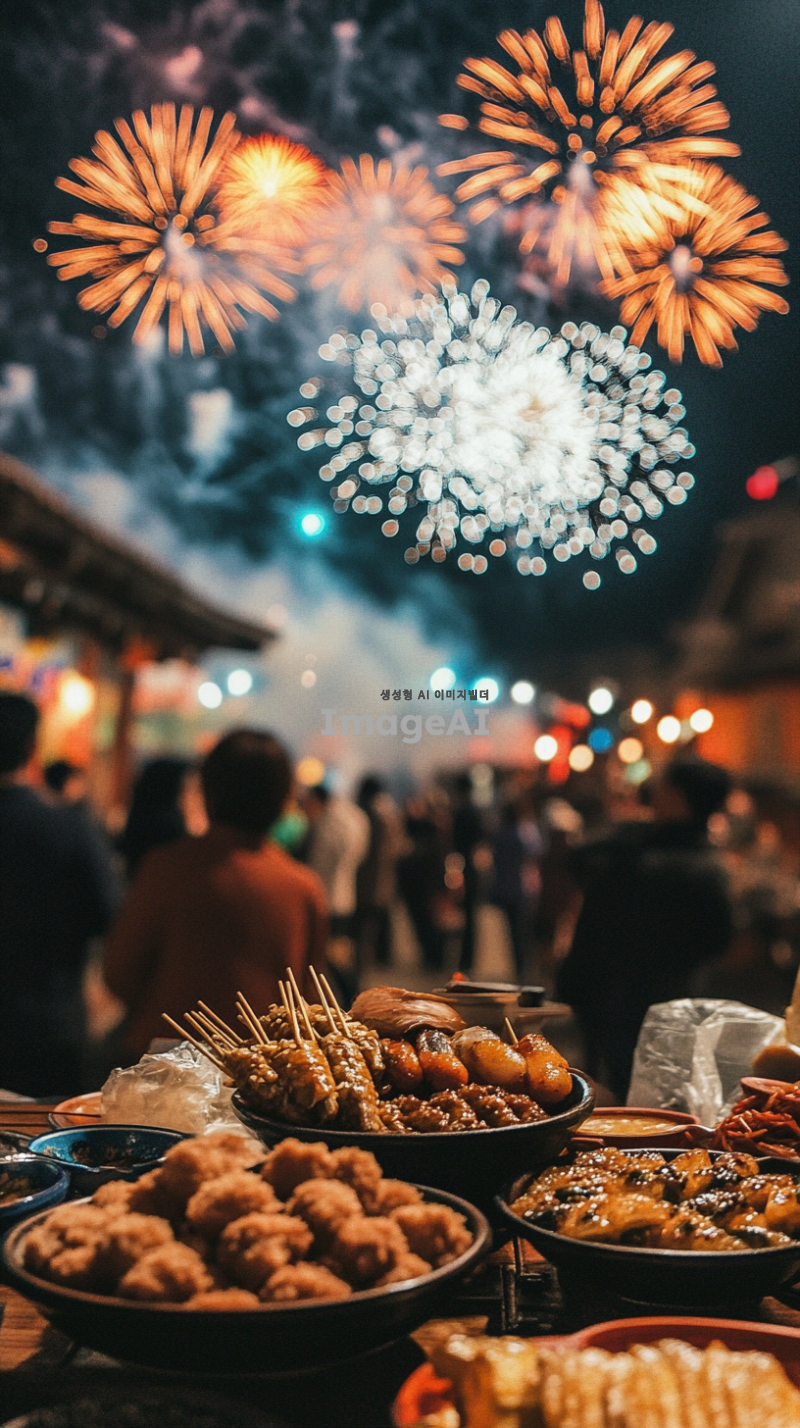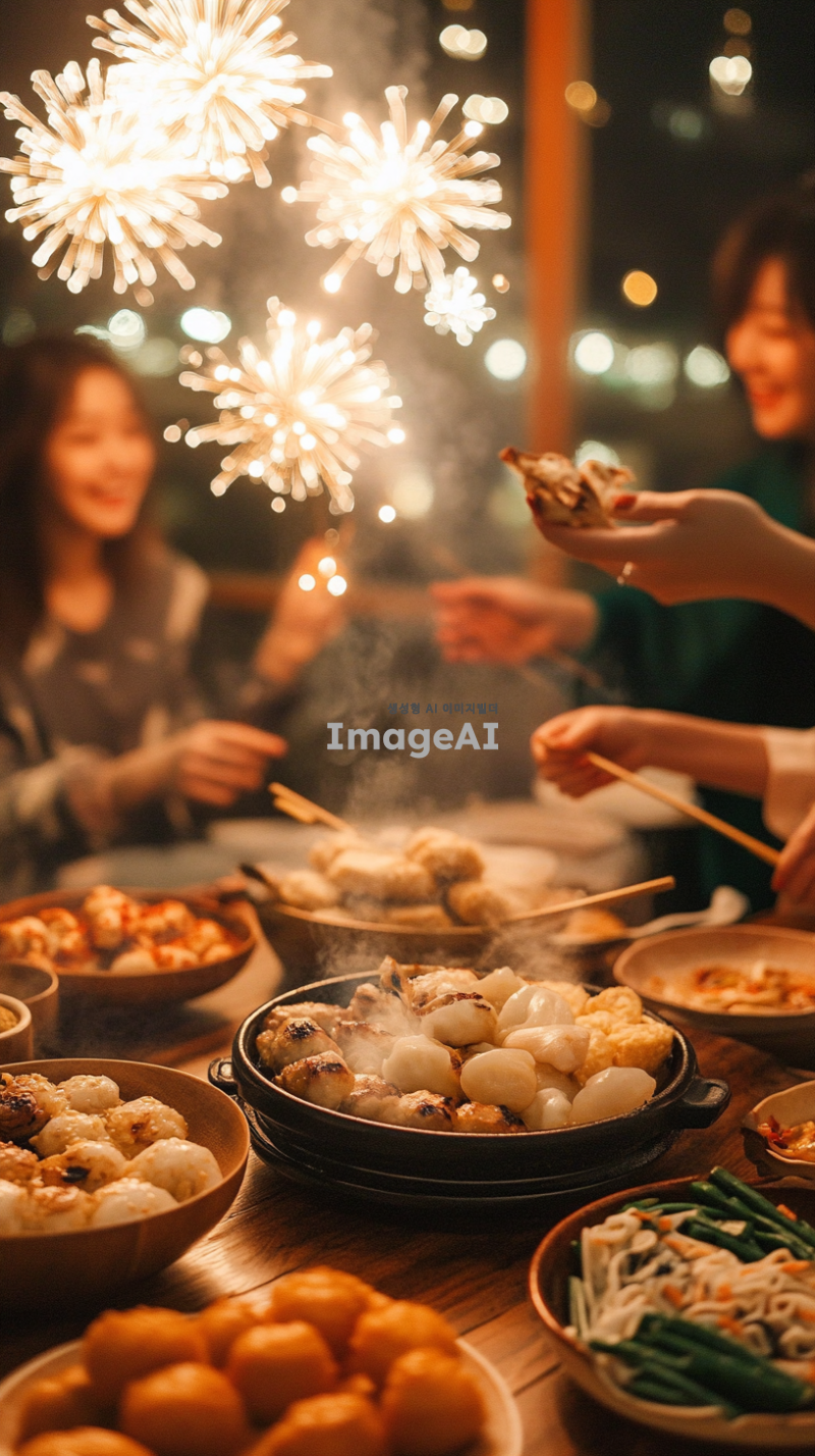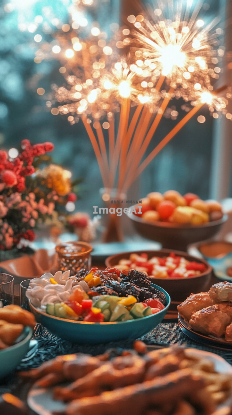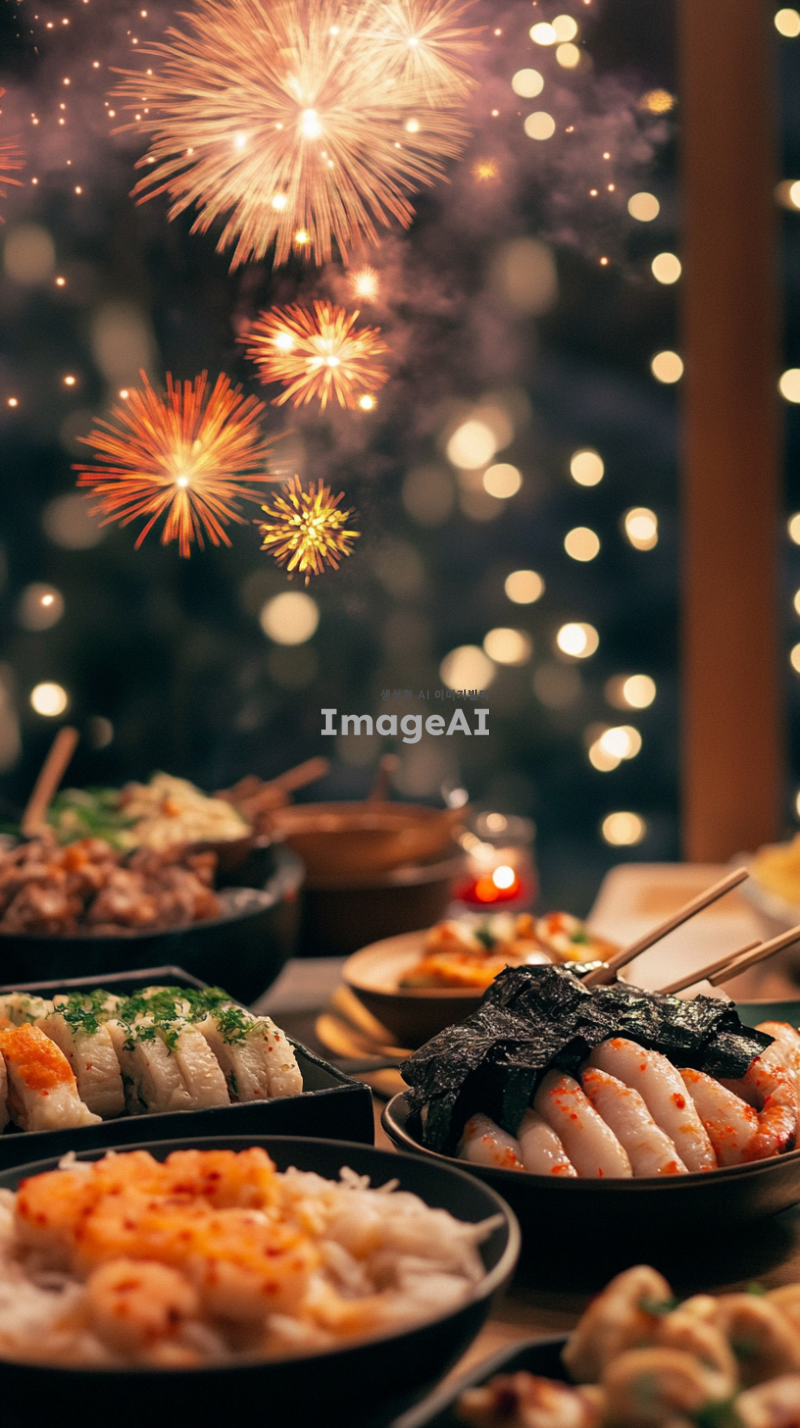 2025년 신년을 맞아 축하하는 분위기의 한국 전통 명절 풍경, 화려한 불꽃놀이와 함께 새해의 희망을 상징하는 다양한 색상의 조명, 한국의 전통 음식과 함께 즐기는 가족들의 모습, 밝고 따뜻한 느낌의 색조, 기쁨과 행복이 넘치는 장면.