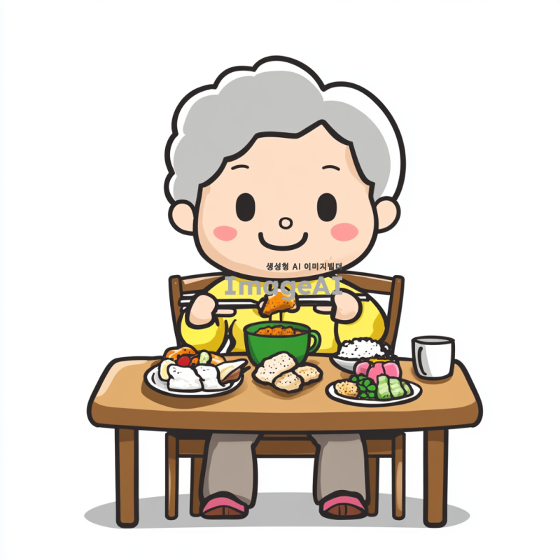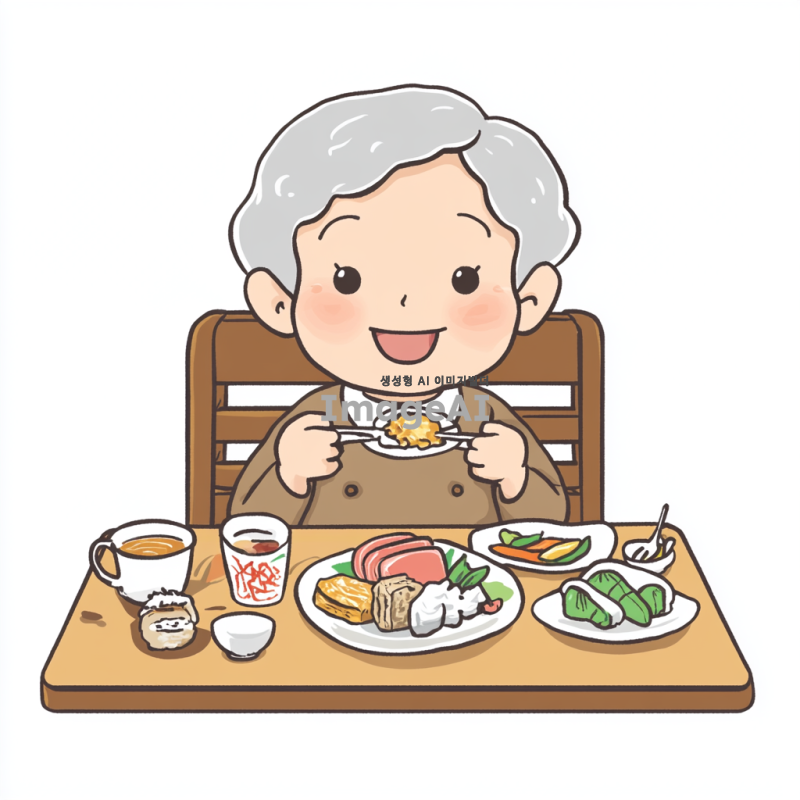 일러스트 라인 선으로만 이루어진 캐릭터. 입체적이지 않은 캐릭터. 회색 단발머리 할머니가 식탁에서 행복한 표정으로 다양한 음식을 먹으며 행복해 하고 있다.
